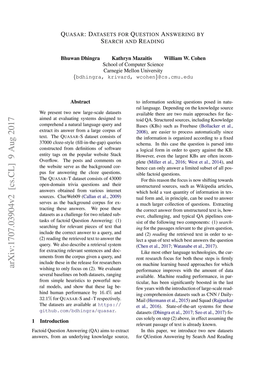 Quasar: Datasets for Question Answering by Search and Reading