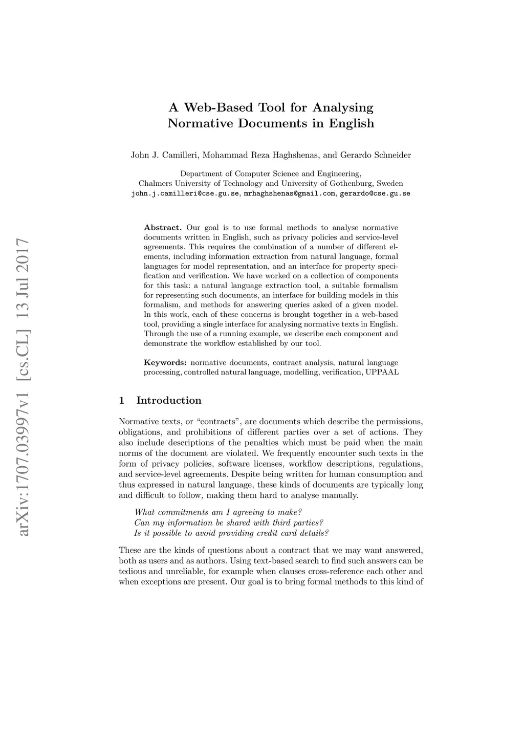 Our goal is to use formal methods to analyse normative documents written in English, such as privacy policies and service-level agreements. This requires the combination of a number of different elements, including information extraction from natural language, formal languages for model representation, and an interface for property specification and verification. We have worked on a collection of components for this task: a natural language extraction tool, a suitable formalism for representing such documents, an interface for building models in this formalism, and methods for answering queries asked of a given model. In this work, each of these concerns is brought together in a web-based tool, providing a single interface for analysing normative texts in English. Through the use of a running example, we describe each component and demonstrate the workflow established by our tool.
