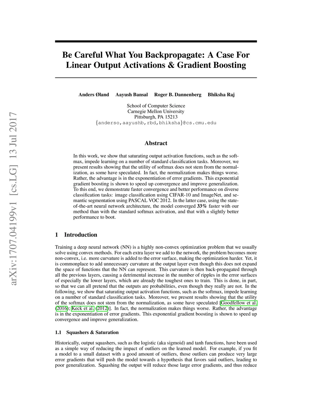 In this work, we show that saturating output activation functions, such as the softmax, impede learning on a number of standard classification tasks. Moreover, we present results showing that the utility of softmax does not stem from the normalization, as some have speculated. In fact, the normalization makes things worse. Rather, the advantage is in the exponentiation of error gradients. This exponential gradient boosting is shown to speed up convergence and improve generalization. To this end, we demonstrate faster convergence and better performance on diverse classification tasks: image classification using CIFAR-10 and ImageNet, and semantic segmentation using PASCAL VOC 2012. In the latter case, using the state-of-the-art neural network architecture, the model converged 33% faster with our method (roughly two days of training less) than with the standard softmax activation, and with a slightly better performance to boot.