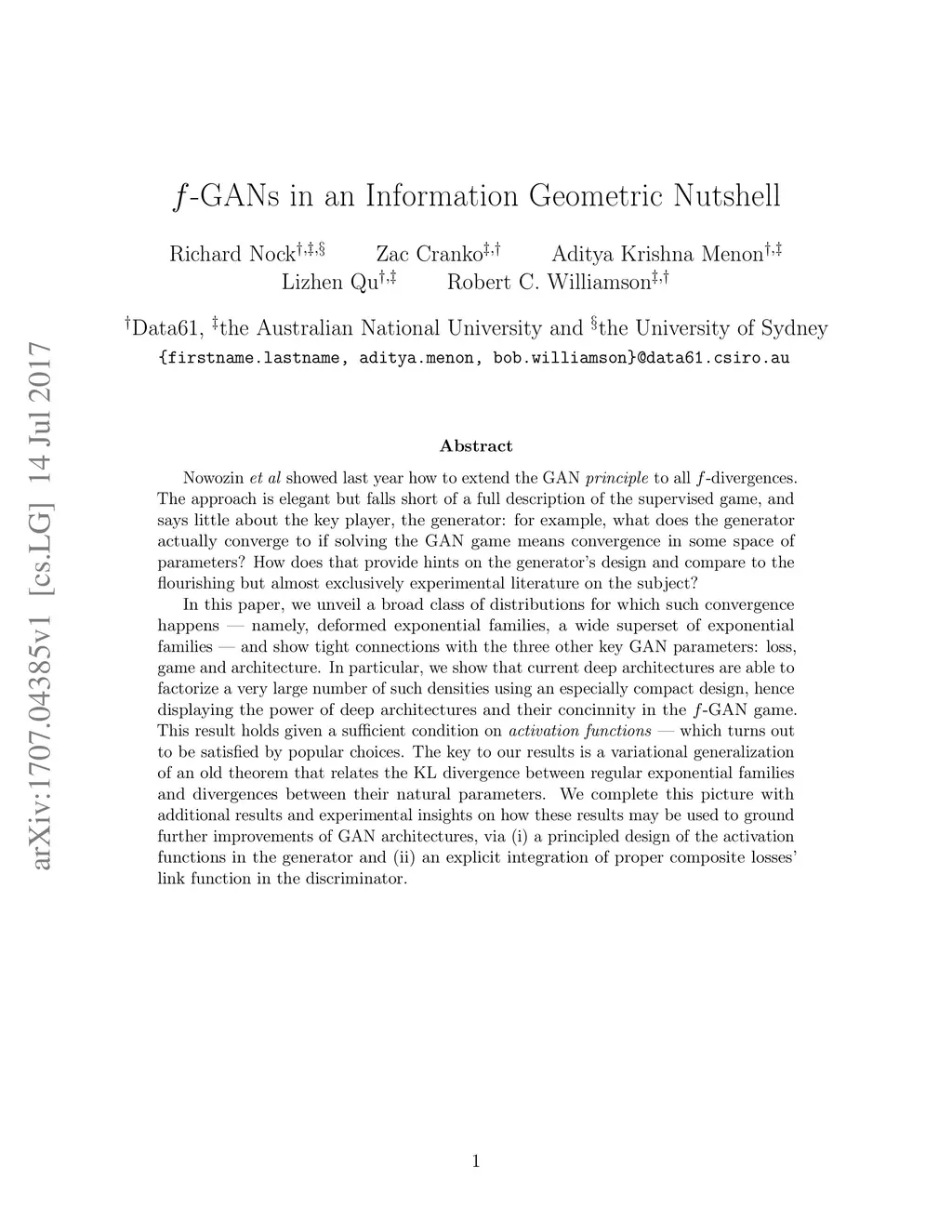 Nowozin \textit{et al} showed last year how to extend the GAN \textit{principle} to all -divergences. The approach is elegant but falls short of a full description of the supervised game, and says little about the key player, the generator: for example, what does the generator actually converge to if solving the GAN game means convergence in some space of parameters? How does that provide hints on the generator's design and compare to the flourishing but almost exclusively experimental literature on the subject? In this paper, we unveil a broad class of distributions for which such convergence happens --- namely, deformed exponential families, a wide superset of exponential families --- and show tight connections with the three other key GAN parameters: loss, game and architecture. In particular, we show that current deep architectures are able to factorize a very large number of such densities using an especially compact design, hence displaying the power of deep architectures and their concinnity in the -GAN game. This result holds given a sufficient condition on \textit{activation functions} --- which turns out to be satisfied by popular choices. The key to our results is a variational generalization of an old theorem that relates the KL divergence between regular exponential families and divergences between their natural parameters. We complete this picture with additional results and experimental insights on how these results may be used to ground further improvements of GAN architectures, via (i) a principled design of the activation functions in the generator and (ii) an explicit integration of proper composite losses' link function in the discriminator.