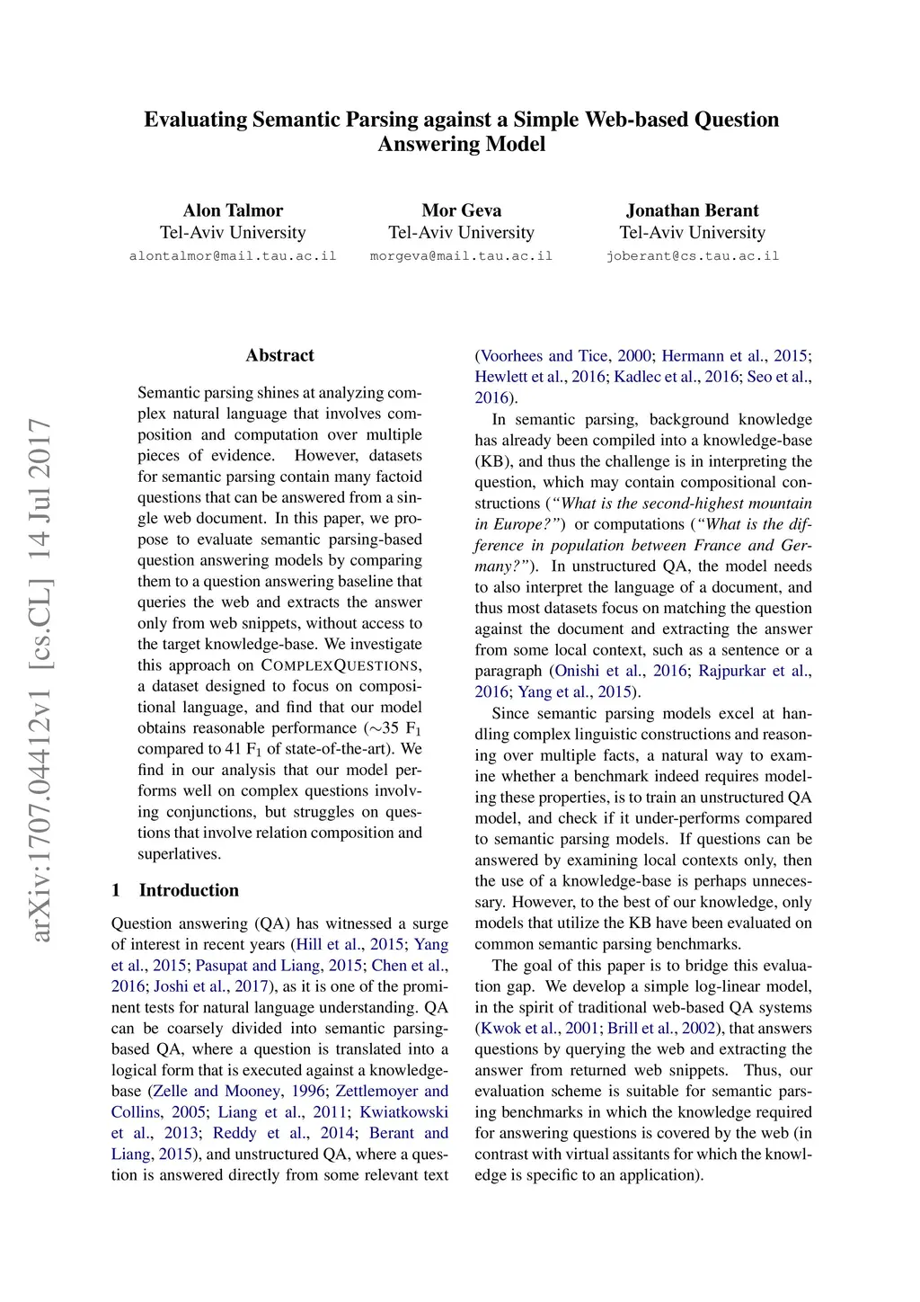 Evaluating Semantic Parsing against a Simple Web-based Question