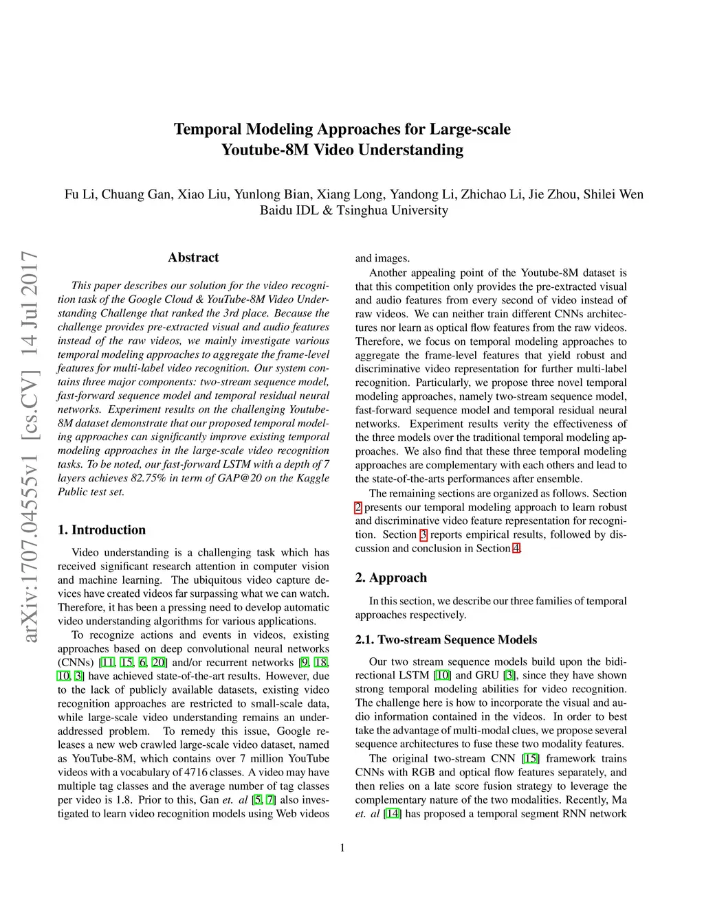 This paper describes our solution for the video recognition task of the Google Cloud and YouTube-8M Video Understanding Challenge that ranked the 3rd place. Because the challenge provides pre-extracted visual and audio features instead of the raw videos, we mainly investigate various temporal modeling approaches to aggregate the frame-level features for multi-label video recognition. Our system contains three major components: two-stream sequence model, fast-forward sequence model and temporal residual neural networks. Experiment results on the challenging Youtube-8M dataset demonstrate that our proposed temporal modeling approaches can significantly improve existing temporal modeling approaches in the large-scale video recognition tasks. To be noted, our fast-forward LSTM with a depth of 7 layers achieves 82.75% in term of GAP@20 on the Kaggle Public test set.