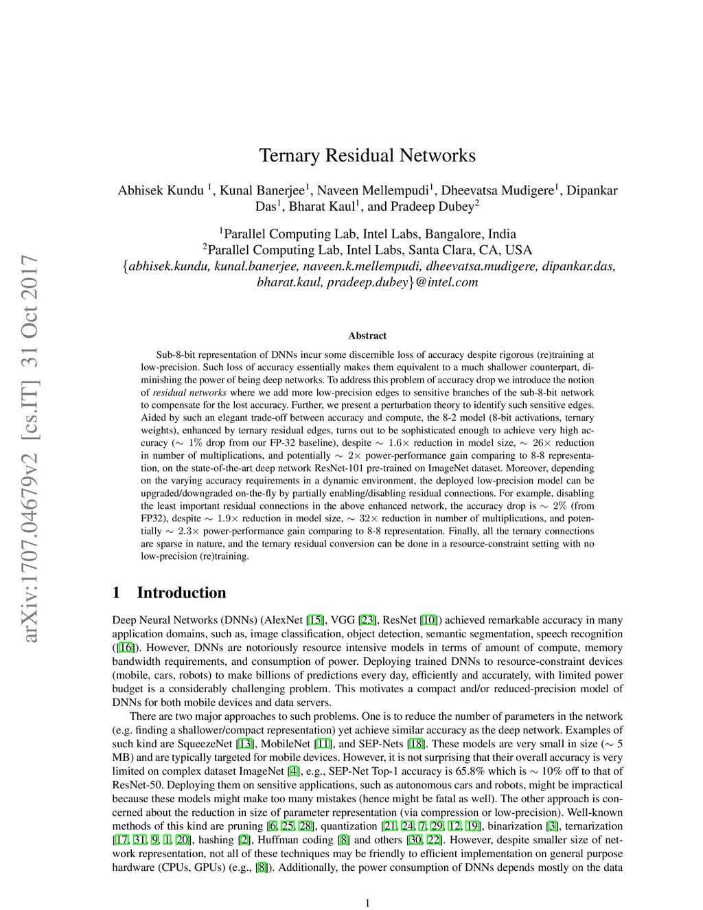 Sub-8-bit representation of DNNs incur some discernible loss of accuracy despite rigorous (re)training at low-precision. Such loss of accuracy essentially makes them equivalent to a much shallower counterpart, diminishing the power of being deep networks. To address this problem of accuracy drop we introduce the notion of \textit{residual networks} where we add more low-precision edges to sensitive branches of the sub-8-bit network to compensate for the lost accuracy. Further, we present a perturbation theory to identify such sensitive edges. Aided by such an elegant trade-off between accuracy and compute, the 8-2 model (8-bit activations, ternary weights), enhanced by ternary residual edges, turns out to be sophisticated enough to achieve very high accuracy ( drop from our FP-32 baseline), despite reduction in model size, reduction in number of multiplications, and potentially power-performance gain comparing to 8-8 representation, on the state-of-the-art deep network ResNet-101 pre-trained on ImageNet dataset. Moreover, depending on the varying accuracy requirements in a dynamic environment, the deployed low-precision model can be upgraded/downgraded on-the-fly by partially enabling/disabling residual connections. For example, disabling the least important residual connections in the above enhanced network, the accuracy drop is (from FP32), despite reduction in model size, reduction in number of multiplications, and potentially power-performance gain comparing to 8-8 representation. Finally, all the ternary connections are sparse in nature, and the ternary residual conversion can be done in a resource-constraint setting with no low-precision (re)training.