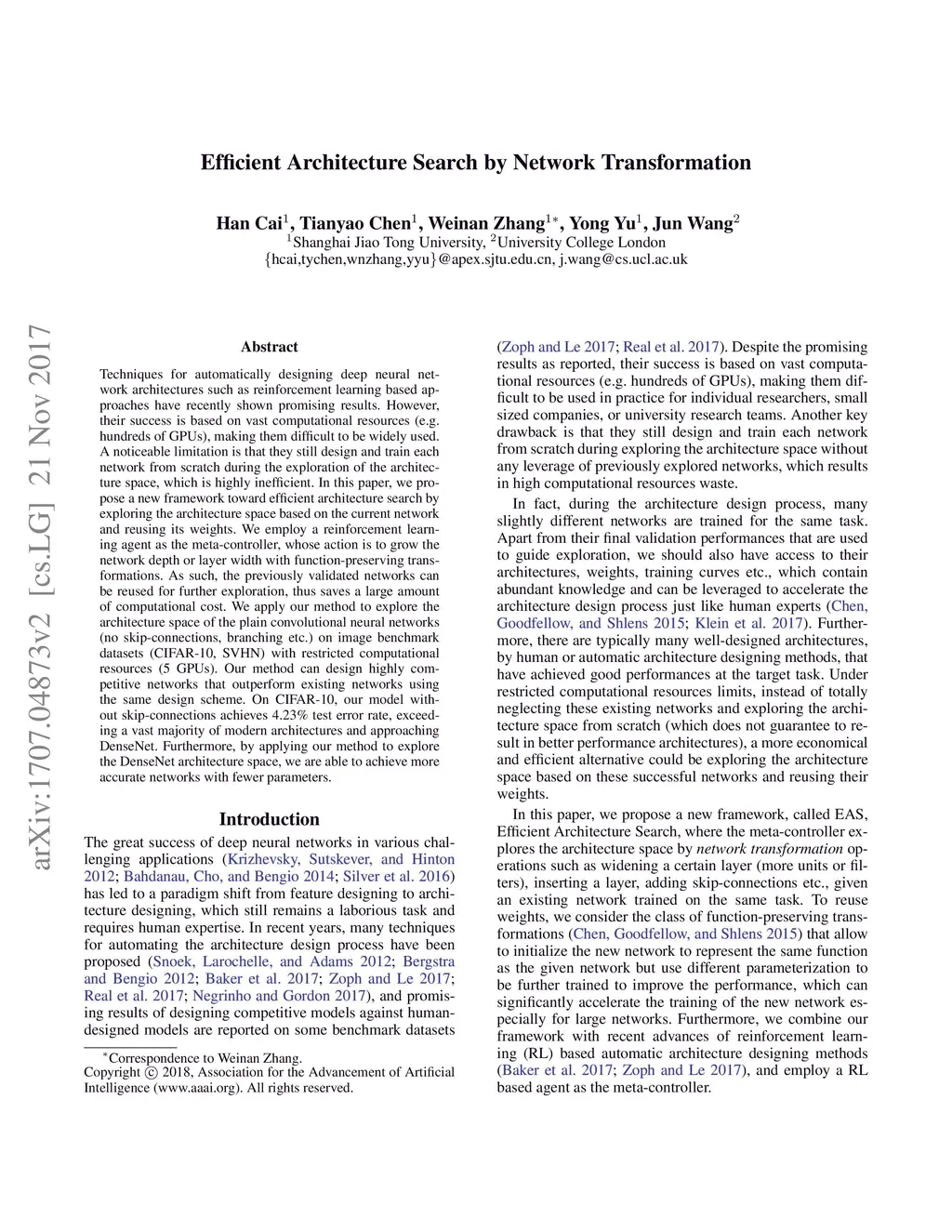 Techniques for automatically designing deep neural network architectures such as reinforcement learning based approaches have recently shown promising results. However, their success is based on vast computational resources (e.g. hundreds of GPUs), making them difficult to be widely used. A noticeable limitation is that they still design and train each network from scratch during the exploration of the architecture space, which is highly inefficient. In this paper, we propose a new framework toward efficient architecture search by exploring the architecture space based on the current network and reusing its weights. We employ a reinforcement learning agent as the meta-controller, whose action is to grow the network depth or layer width with function-preserving transformations. As such, the previously validated networks can be reused for further exploration, thus saves a large amount of computational cost. We apply our method to explore the architecture space of the plain convolutional neural networks (no skip-connections, branching etc.) on image benchmark datasets (CIFAR-10, SVHN) with restricted computational resources (5 GPUs). Our method can design highly competitive networks that outperform existing networks using the same design scheme. On CIFAR-10, our model without skip-connections achieves 4.23\% test error rate, exceeding a vast majority of modern architectures and approaching DenseNet. Furthermore, by applying our method to explore the DenseNet architecture space, we are able to achieve more accurate networks with fewer parameters.