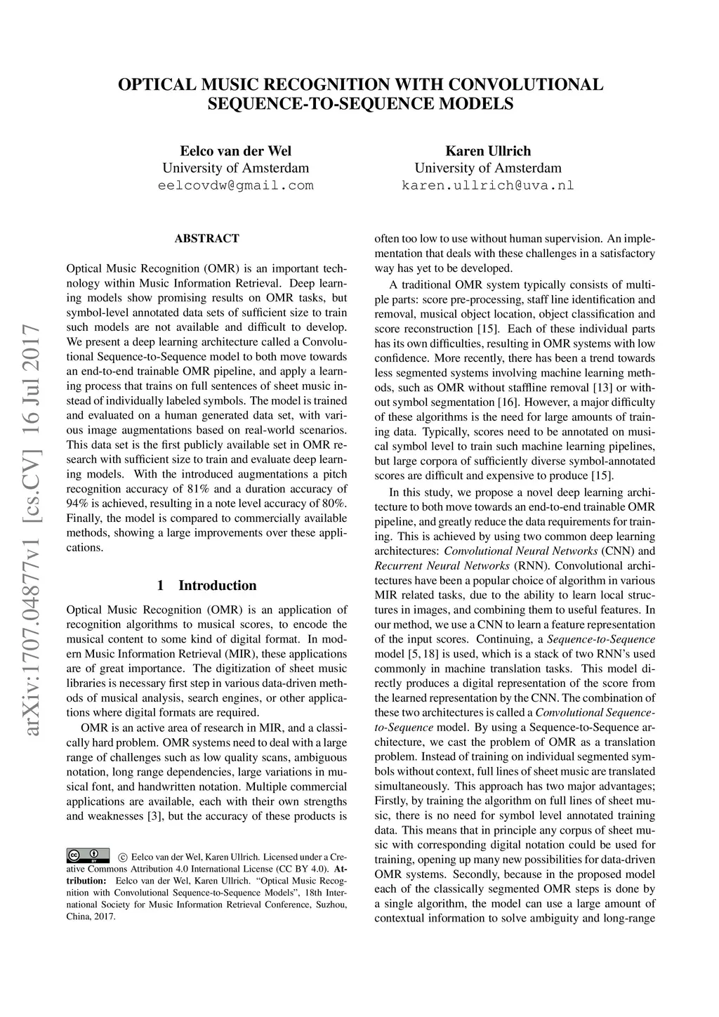 Optical Music Recognition (OMR) is an important technology within Music Information Retrieval. Deep learning models show promising results on OMR tasks, but symbol-level annotated data sets of sufficient size to train such models are not available and difficult to develop. We present a deep learning architecture called a Convolutional Sequence-to-Sequence model to both move towards an end-to-end trainable OMR pipeline, and apply a learning process that trains on full sentences of sheet music instead of individually labeled symbols. The model is trained and evaluated on a human generated data set, with various image augmentations based on real-world scenarios. This data set is the first publicly available set in OMR research with sufficient size to train and evaluate deep learning models. With the introduced augmentations a pitch recognition accuracy of 81% and a duration accuracy of 94% is achieved, resulting in a note level accuracy of 80%. Finally, the model is compared to commercially available methods, showing a large improvements over these applications.