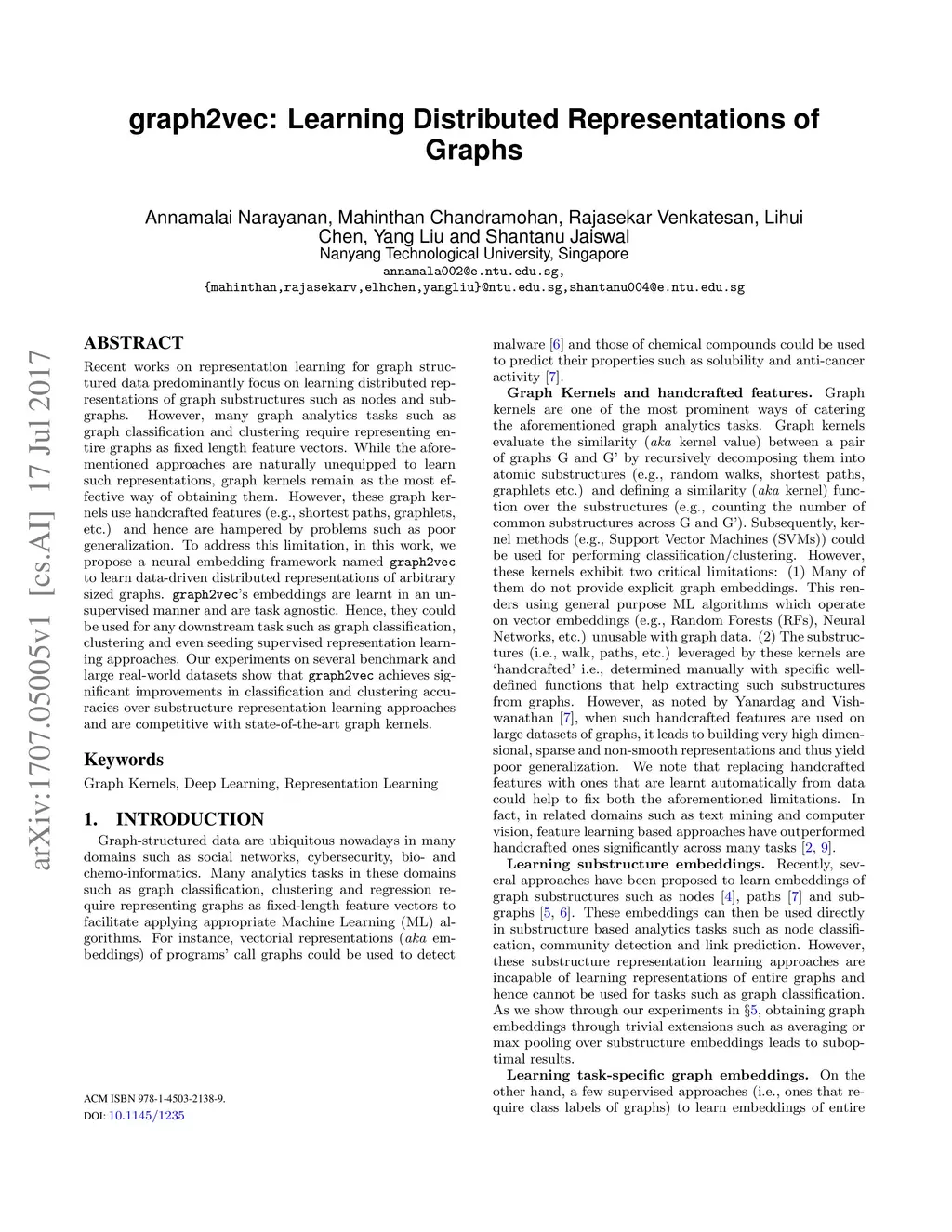 Recent works on representation learning for graph structured data predominantly focus on learning distributed representations of graph substructures such as nodes and subgraphs. However, many graph analytics tasks such as graph classification and clustering require representing entire graphs as fixed length feature vectors. While the aforementioned approaches are naturally unequipped to learn such representations, graph kernels remain as the most effective way of obtaining them. However, these graph kernels use handcrafted features (e.g., shortest paths, graphlets, etc.) and hence are hampered by problems such as poor generalization. To address this limitation, in this work, we propose a neural embedding framework named graph2vec to learn data-driven distributed representations of arbitrary sized graphs. graph2vec's embeddings are learnt in an unsupervised manner and are task agnostic. Hence, they could be used for any downstream task such as graph classification, clustering and even seeding supervised representation learning approaches. Our experiments on several benchmark and large real-world datasets show that graph2vec achieves significant improvements in classification and clustering accuracies over substructure representation learning approaches and are competitive with state-of-the-art graph kernels.