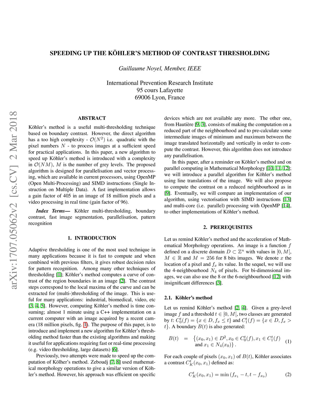 K{\"o}hler's method is a useful multi-thresholding technique based on boundary contrast. However, the direct algorithm has a too high complexity-O(N 2) i.e. quadratic with the pixel numbers N-to process images at a sufficient speed for practical applications. In this paper, a new algorithm to speed up K{\"o}hler's method is introduced with a complexity in O(N M), M is the number of grey levels. The proposed algorithm is designed for parallelisation and vector processing , which are available in current processors, using OpenMP (Open Multi-Processing) and SIMD instructions (Single Instruction on Multiple Data). A fast implementation allows a gain factor of 405 in an image of 18 million pixels and a video processing in real time (gain factor of 96).
