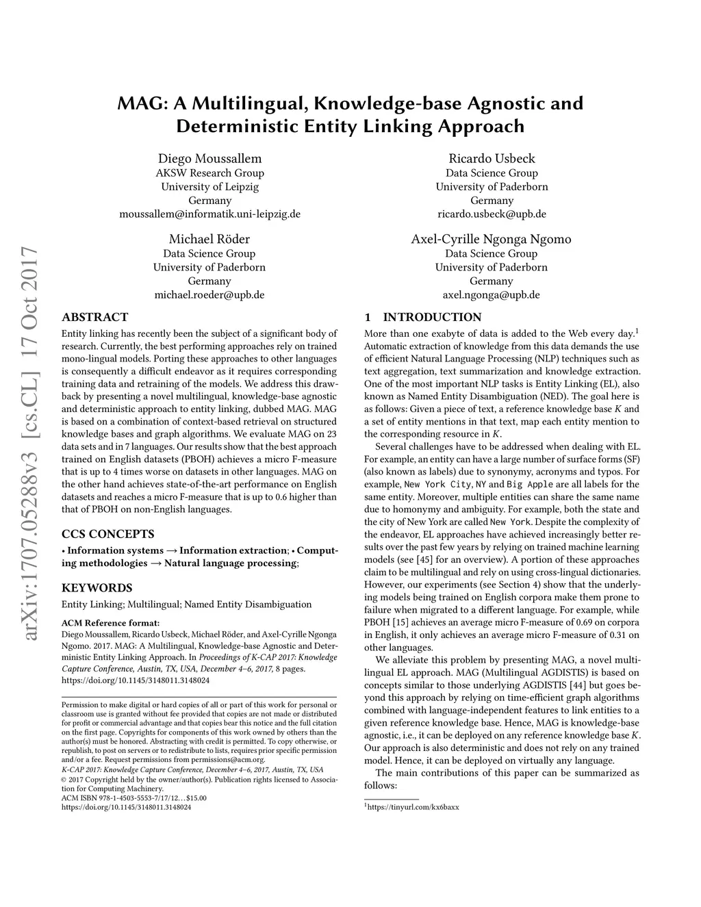 Entity linking has recently been the subject of a significant body of research. Currently, the best performing approaches rely on trained mono-lingual models. Porting these approaches to other languages is consequently a difficult endeavor as it requires corresponding training data and retraining of the models. We address this drawback by presenting a novel multilingual, knowledge-based agnostic and deterministic approach to entity linking, dubbed MAG. MAG is based on a combination of context-based retrieval on structured knowledge bases and graph algorithms. We evaluate MAG on 23 data sets and in 7 languages. Our results show that the best approach trained on English datasets (PBOH) achieves a micro F-measure that is up to 4 times worse on datasets in other languages. MAG, on the other hand, achieves state-of-the-art performance on English datasets and reaches a micro F-measure that is up to 0.6 higher than that of PBOH on non-English languages.