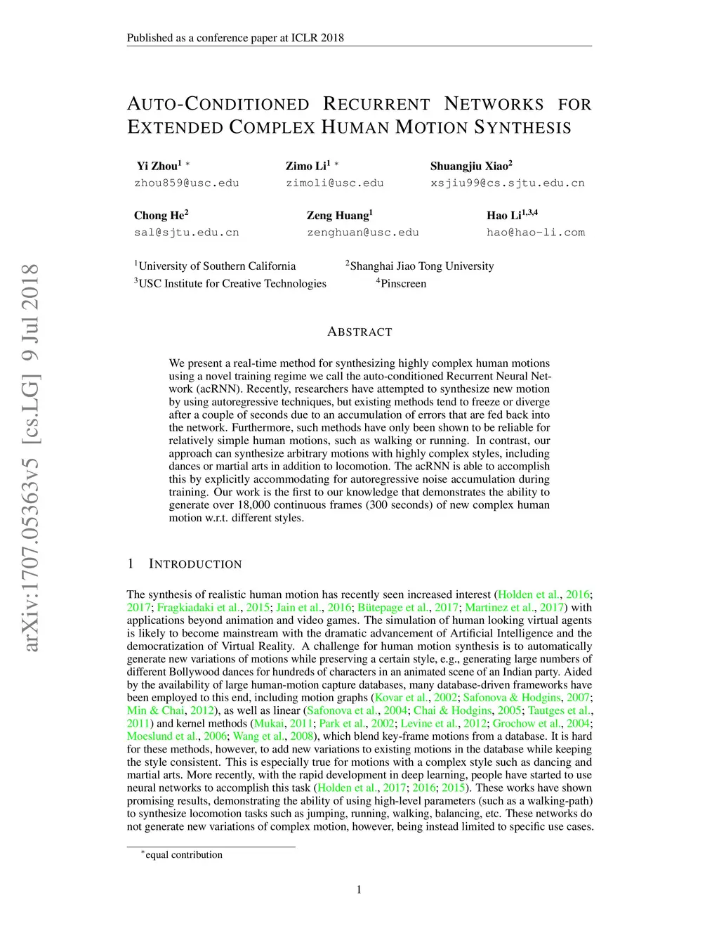 Auto-Conditioned Recurrent Networks for Extended Complex Human Motion