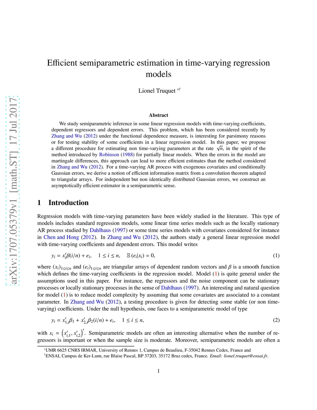 We study semiparametric inference in some linear regression models with time-varying coefficients, dependent regressors and dependent errors. This problem, which has been considered recently by Zhang and Wu (2012) under the functional dependence measure, is interesting for parsimony reasons or for testing stability of some coefficients in a linear regression model. In this paper, we propose a different procedure for estimating non time-varying parameters at the rate root n, in the spirit of the method introduced by Robinson (1988) for partially linear models. When the errors in the model are martingale differences, this approach can lead to more effcient estimates than the method considered in Zhang and Wu (2012). For a time-varying AR process with exogenous covariates and conditionally Gaussian errors, we derive a notion of efficient information matrix from a convolution theorem adapted to triangular arrays. For independent but non identically distributed Gaussian errors, we construct an asymptotically efficient estimator in a semiparametric sense.
