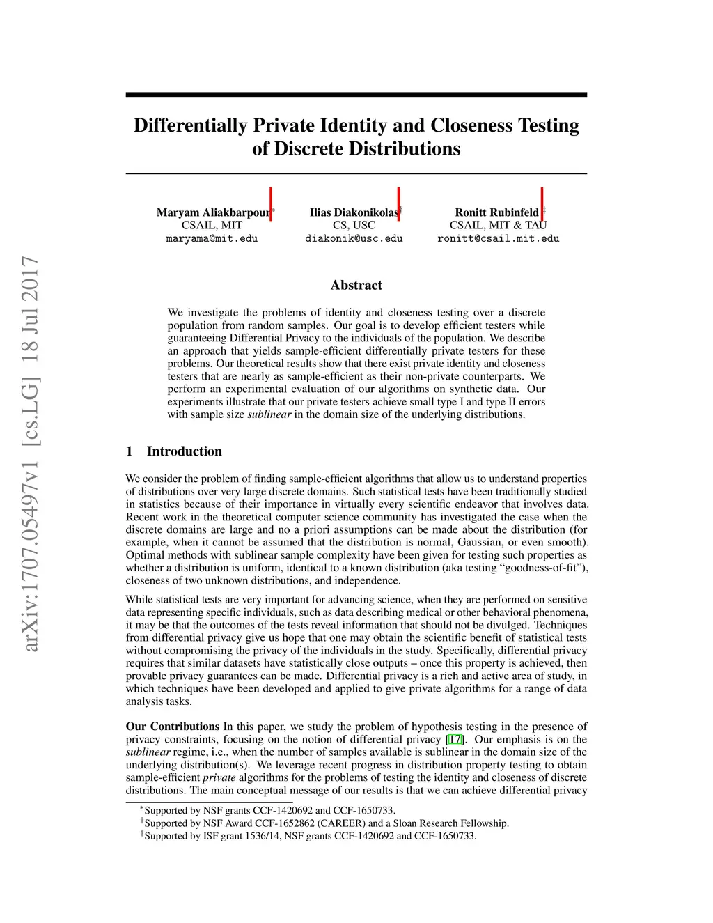 We investigate the problems of identity and closeness testing over a discrete population from random samples. Our goal is to develop efficient testers while guaranteeing Differential Privacy to the individuals of the population. We describe an approach that yields sample-efficient differentially private testers for these problems. Our theoretical results show that there exist private identity and closeness testers that are nearly as sample-efficient as their non-private counterparts. We perform an experimental evaluation of our algorithms on synthetic data. Our experiments illustrate that our private testers achieve small type I and type II errors with sample size sublinear in the domain size of the underlying distributions.