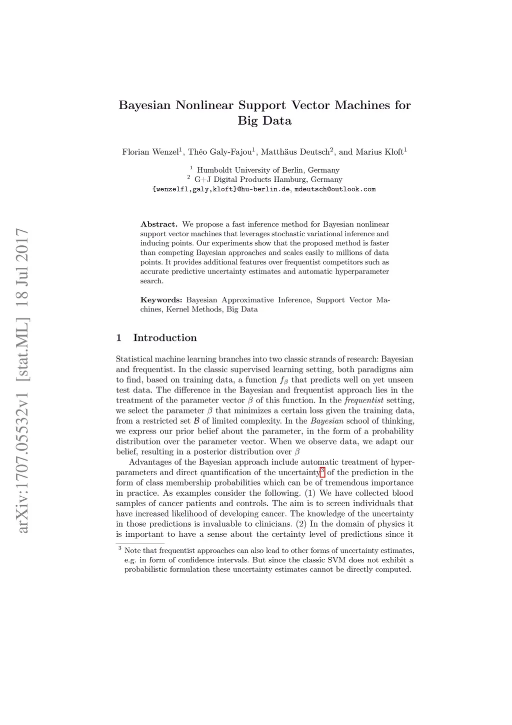 We propose a fast inference method for Bayesian nonlinear support vector machines that leverages stochastic variational inference and inducing points. Our experiments show that the proposed method is faster than competing Bayesian approaches and scales easily to millions of data points. It provides additional features over frequentist competitors such as accurate predictive uncertainty estimates and automatic hyperparameter search.