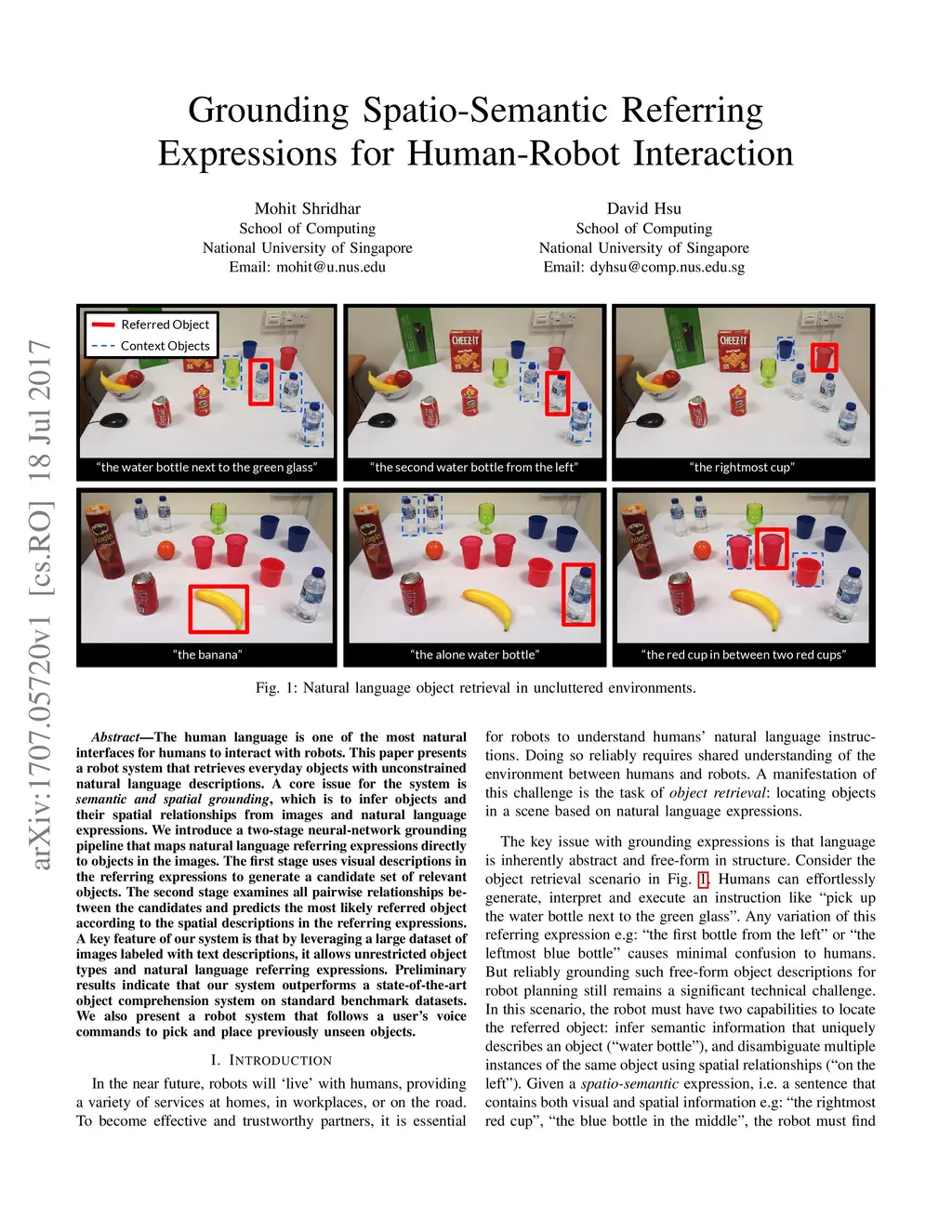 The human language is one of the most natural interfaces for humans to interact with robots. This paper presents a robot system that retrieves everyday objects with unconstrained natural language descriptions. A core issue for the system is semantic and spatial grounding, which is to infer objects and their spatial relationships from images and natural language expressions. We introduce a two-stage neural-network grounding pipeline that maps natural language referring expressions directly to objects in the images. The first stage uses visual descriptions in the referring expressions to generate a candidate set of relevant objects. The second stage examines all pairwise relationships between the candidates and predicts the most likely referred object according to the spatial descriptions in the referring expressions. A key feature of our system is that by leveraging a large dataset of images labeled with text descriptions, it allows unrestricted object types and natural language referring expressions. Preliminary results indicate that our system outperforms a near state-of-the-art object comprehension system on standard benchmark datasets. We also present a robot system that follows voice commands to pick and place previously unseen objects.