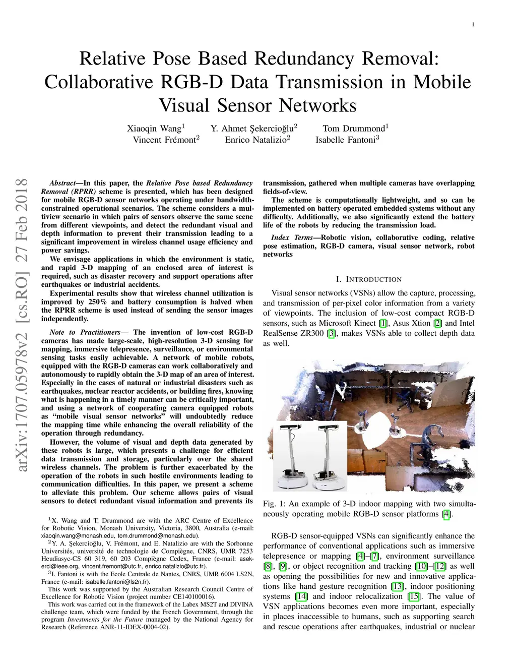The Relative Pose based Redundancy Removal(RPRR) scheme is presented, which has been designed for mobile RGB-D sensor networks operating under bandwidth-constrained operational scenarios. Participating sensor nodes detect the redundant visual and depth information to prevent their transmission leading to a significant improvement in wireless channel usage efficiency and power savings. Experimental results show that wireless channel utilization is improved by 250% and battery consumption is halved when the RPRR scheme is used instead of sending the sensor images independently.