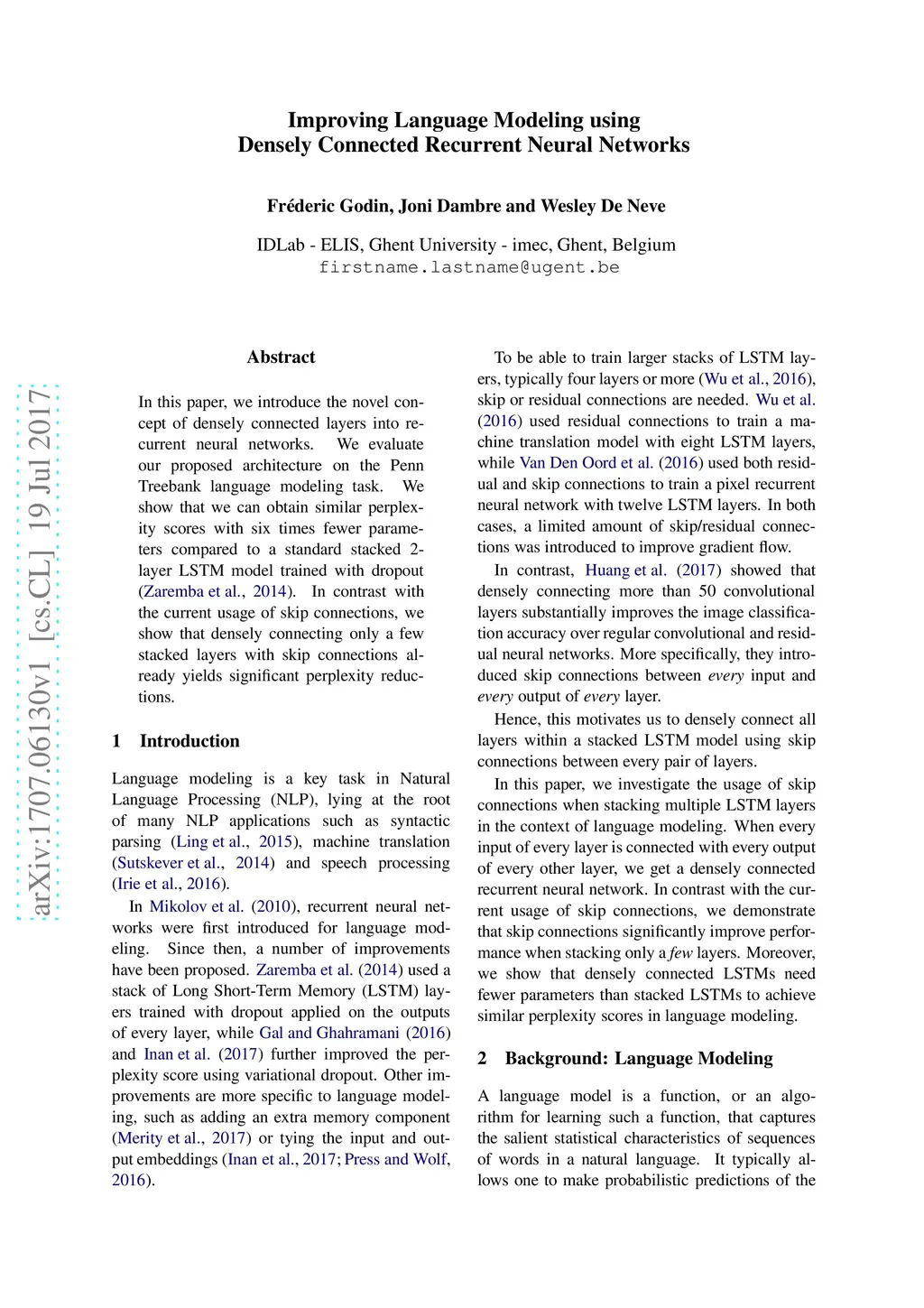 In this paper, we introduce the novel concept of densely connected layers into recurrent neural networks. We evaluate our proposed architecture on the Penn Treebank language modeling task. We show that we can obtain similar perplexity scores with six times fewer parameters compared to a standard stacked 2-layer LSTM model trained with dropout (Zaremba et al. 2014). In contrast with the current usage of skip connections, we show that densely connecting only a few stacked layers with skip connections already yields significant perplexity reductions.