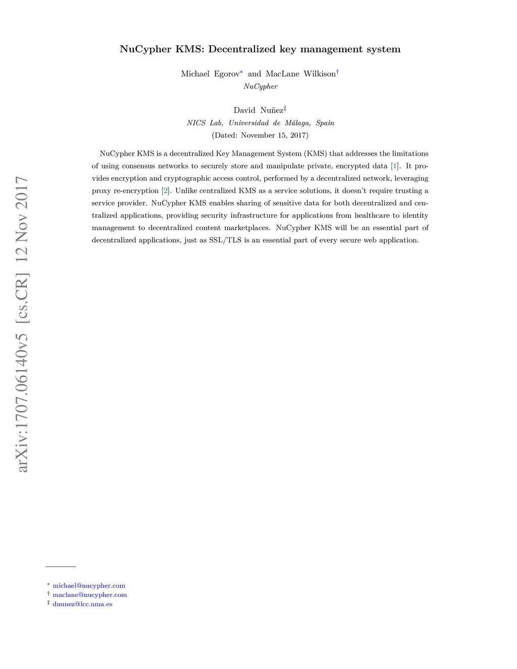 NuCypher KMS is a decentralized Key Management System (KMS) that addresses the limitations of using consensus networks to securely store and manipulate private, encrypted data. It provides encryption and cryptographic access controls, performed by a decentralized network, leveraging proxy re-encryption. Unlike centralized KMS as a service solutions, it doesn't require trusting a service provider. NuCypher KMS enables sharing of sensitive data for both decentralized and centralized applications, providing security infrastructure for applications from healthcare to identity management to decentralized content marketplaces. NuCypher KMS will be an essential part of decentralized applications, just as SSL/TLS is an essential part of every secure web application.
