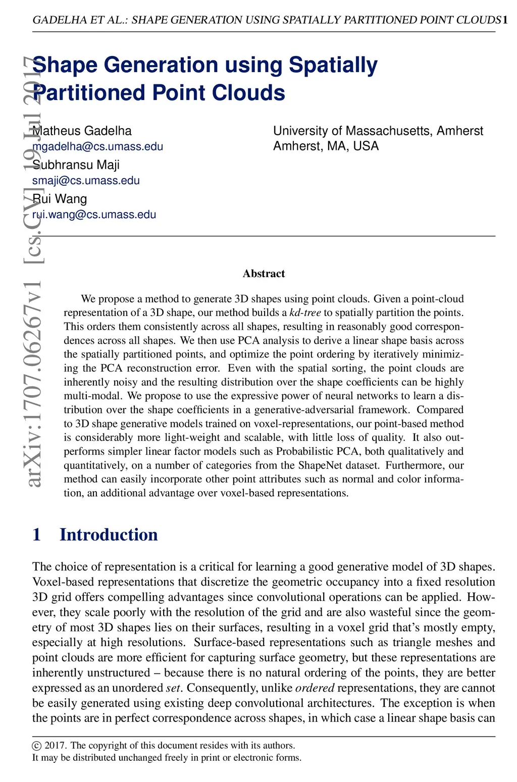 We propose a method to generate 3D shapes using point clouds. Given a point-cloud representation of a 3D shape, our method builds a kd-tree to spatially partition the points. This orders them consistently across all shapes, resulting in reasonably good correspondences across all shapes. We then use PCA analysis to derive a linear shape basis across the spatially partitioned points, and optimize the point ordering by iteratively minimizing the PCA reconstruction error. Even with the spatial sorting, the point clouds are inherently noisy and the resulting distribution over the shape coefficients can be highly multi-modal. We propose to use the expressive power of neural networks to learn a distribution over the shape coefficients in a generative-adversarial framework. Compared to 3D shape generative models trained on voxel-representations, our point-based method is considerably more light-weight and scalable, with little loss of quality. It also outperforms simpler linear factor models such as Probabilistic PCA, both qualitatively and quantitatively, on a number of categories from the ShapeNet dataset. Furthermore, our method can easily incorporate other point attributes such as normal and color information, an additional advantage over voxel-based representations.