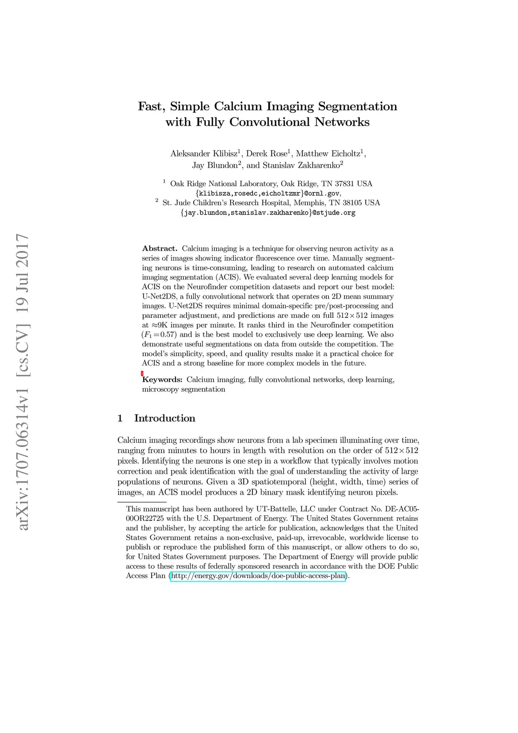 Calcium imaging is a technique for observing neuron activity as a series of images showing indicator fluorescence over time. Manually segmenting neurons is time-consuming, leading to research on automated calcium imaging segmentation (ACIS). We evaluated several deep learning models for ACIS on the Neurofinder competition datasets and report our best model: U-Net2DS, a fully convolutional network that operates on 2D mean summary images. U-Net2DS requires minimal domain-specific pre/post-processing and parameter adjustment, and predictions are made on full images at 9K images per minute. It ranks third in the Neurofinder competition () and is the best model to exclusively use deep learning. We also demonstrate useful segmentations on data from outside the competition. The model's simplicity, speed, and quality results make it a practical choice for ACIS and a strong baseline for more complex models in the future.