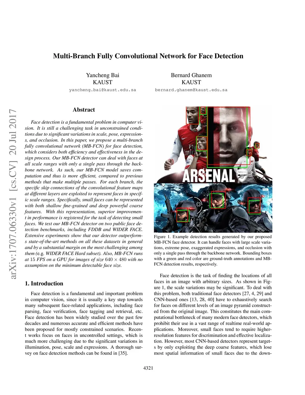 Face detection is a fundamental problem in computer vision. It is still a challenging task in unconstrained conditions due to significant variations in scale, pose, expressions, and occlusion. In this paper, we propose a multi-branch fully convolutional network (MB-FCN) for face detection, which considers both efficiency and effectiveness in the design process. Our MB-FCN detector can deal with faces at all scale ranges with only a single pass through the backbone network. As such, our MB-FCN model saves computation and thus is more efficient, compared to previous methods that make multiple passes. For each branch, the specific skip connections of the convolutional feature maps at different layers are exploited to represent faces in specific scale ranges. Specifically, small faces can be represented with both shallow fine-grained and deep powerful coarse features. With this representation, superior improvement in performance is registered for the task of detecting small faces. We test our MB-FCN detector on two public face detection benchmarks, including FDDB and WIDER FACE. Extensive experiments show that our detector outperforms state-of-the-art methods on all these datasets in general and by a substantial margin on the most challenging among them (e.g. WIDER FACE Hard subset). Also, MB-FCN runs at 15 FPS on a GPU for images of size 640 x 480 with no assumption on the minimum detectable face size.