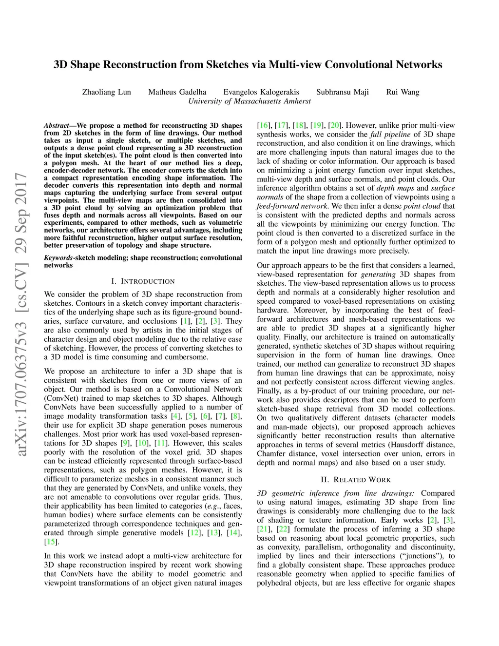 We propose a method for reconstructing 3D shapes from 2D sketches in the form of line drawings. Our method takes as input a single sketch, or multiple sketches, and outputs a dense point cloud representing a 3D reconstruction of the input sketch(es). The point cloud is then converted into a polygon mesh. At the heart of our method lies a deep, encoder-decoder network. The encoder converts the sketch into a compact representation encoding shape information. The decoder converts this representation into depth and normal maps capturing the underlying surface from several output viewpoints. The multi-view maps are then consolidated into a 3D point cloud by solving an optimization problem that fuses depth and normals across all viewpoints. Based on our experiments, compared to other methods, such as volumetric networks, our architecture offers several advantages, including more faithful reconstruction, higher output surface resolution, better preservation of topology and shape structure.