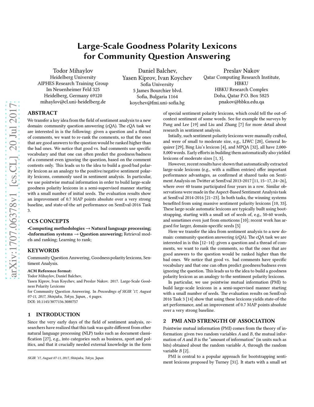 Large-Scale Goodness Polarity Lexicons for Community Question Answering