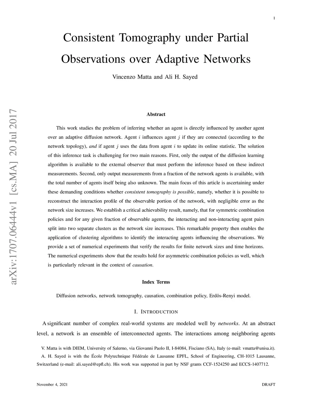 This work studies the problem of inferring whether an agent is directly influenced by another agent over an adaptive diffusion network. Agent i influences agent j if they are connected (according to the network topology), and if agent j uses the data from agent i to update its online statistic. The solution of this inference task is challenging for two main reasons. First, only the output of the diffusion learning algorithm is available to the external observer that must perform the inference based on these indirect measurements. Second, only output measurements from a fraction of the network agents is available, with the total number of agents itself being also unknown. The main focus of this article is ascertaining under these demanding conditions whether consistent tomography is possible, namely, whether it is possible to reconstruct the interaction profile of the observable portion of the network, with negligible error as the network size increases. We establish a critical achievability result, namely, that for symmetric combination policies and for any given fraction of observable agents, the interacting and non-interacting agent pairs split into two separate clusters as the network size increases. This remarkable property then enables the application of clustering algorithms to identify the interacting agents influencing the observations. We provide a set of numerical experiments that verify the results for finite network sizes and time horizons. The numerical experiments show that the results hold for asymmetric combination policies as well, which is particularly relevant in the context of causation.