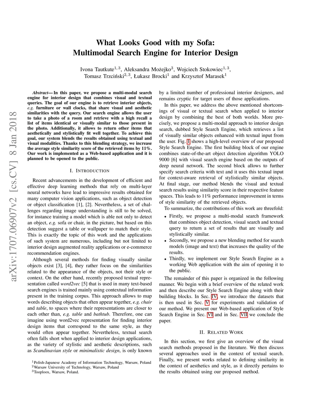 In this paper, we propose a multi-modal search engine for interior design that combines visual and textual queries. The goal of our engine is to retrieve interior objects, e.g. furniture or wall clocks, that share visual and aesthetic similarities with the query. Our search engine allows the user to take a photo of a room and retrieve with a high recall a list of items identical or visually similar to those present in the photo. Additionally, it allows to return other items that aesthetically and stylistically fit well together. To achieve this goal, our system blends the results obtained using textual and visual modalities. Thanks to this blending strategy, we increase the average style similarity score of the retrieved items by 11%. Our work is implemented as a Web-based application and it is planned to be opened to the public.