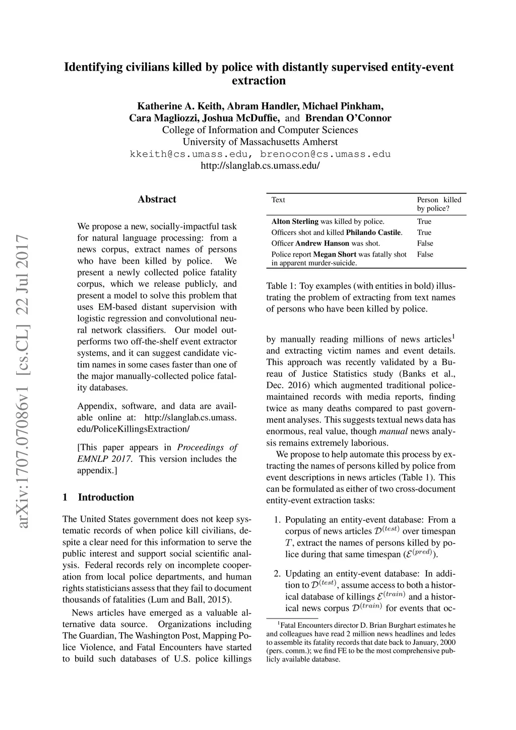 We propose a new, socially-impactful task for natural language processing: from a news corpus, extract names of persons who have been killed by police. We present a newly collected police fatality corpus, which we release publicly, and present a model to solve this problem that uses EM-based distant supervision with logistic regression and convolutional neural network classifiers. Our model outperforms two off-the-shelf event extractor systems, and it can suggest candidate victim names in some cases faster than one of the major manually-collected police fatality databases.