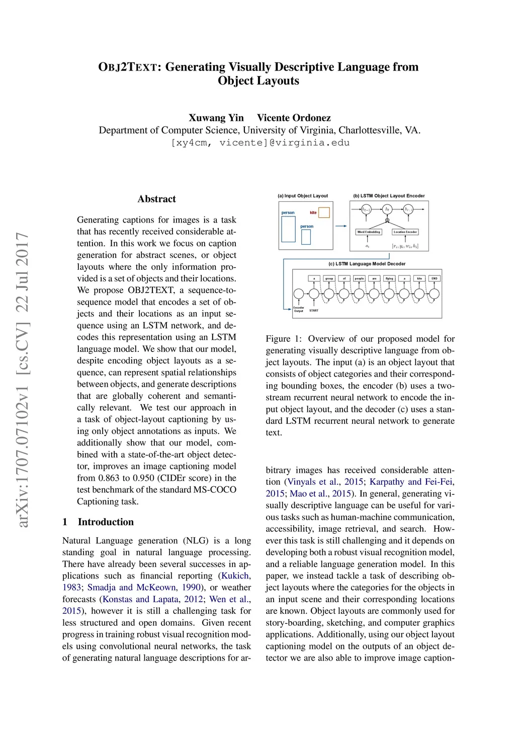 Generating captions for images is a task that has recently received considerable attention. In this work we focus on caption generation for abstract scenes, or object layouts where the only information provided is a set of objects and their locations. We propose OBJ2TEXT, a sequence-to-sequence model that encodes a set of objects and their locations as an input sequence using an LSTM network, and decodes this representation using an LSTM language model. We show that our model, despite encoding object layouts as a sequence, can represent spatial relationships between objects, and generate descriptions that are globally coherent and semantically relevant. We test our approach in a task of object-layout captioning by using only object annotations as inputs. We additionally show that our model, combined with a state-of-the-art object detector, improves an image captioning model from 0.863 to 0.950 (CIDEr score) in the test benchmark of the standard MS-COCO Captioning task.