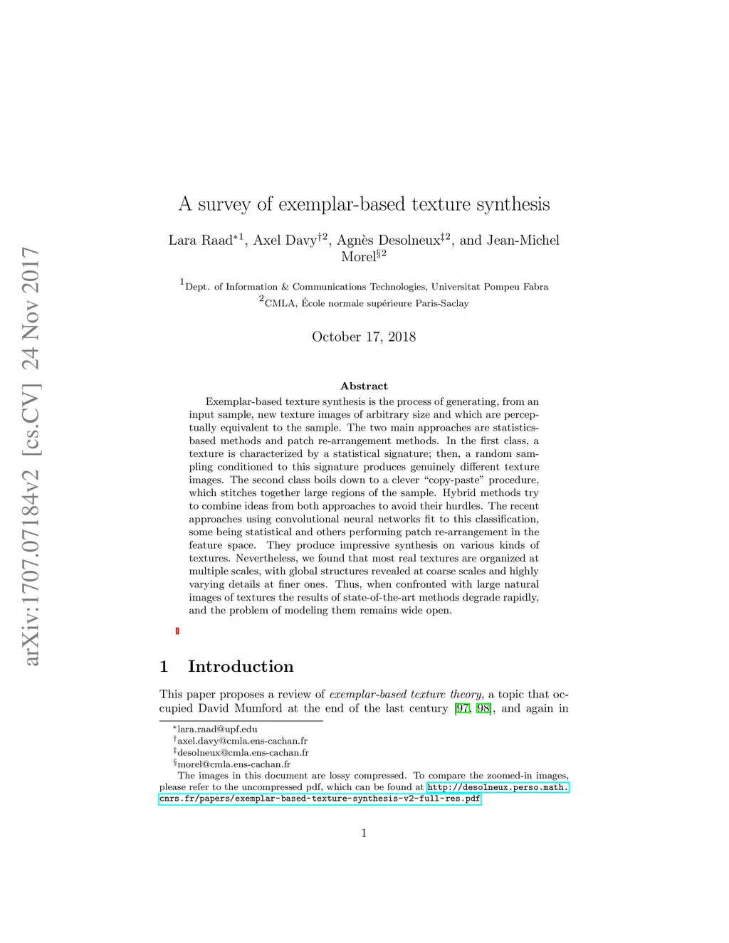Exemplar-based texture synthesis is the process of generating, from an input sample, new texture images of arbitrary size and which are perceptually equivalent to the sample. The two main approaches are statistics-based methods and patch re-arrangement methods. In the first class, a texture is characterized by a statistical signature; then, a random sampling conditioned to this signature produces genuinely different texture images. The second class boils down to a clever "copy-paste" procedure, which stitches together large regions of the sample. Hybrid methods try to combine ideas from both approaches to avoid their hurdles. The recent approaches using convolutional neural networks fit to this classification, some being statistical and others performing patch re-arrangement in the feature space. They produce impressive synthesis on various kinds of textures. Nevertheless, we found that most real textures are organized at multiple scales, with global structures revealed at coarse scales and highly varying details at finer ones. Thus, when confronted with large natural images of textures the results of state-of-the-art methods degrade rapidly, and the problem of modeling them remains wide open.