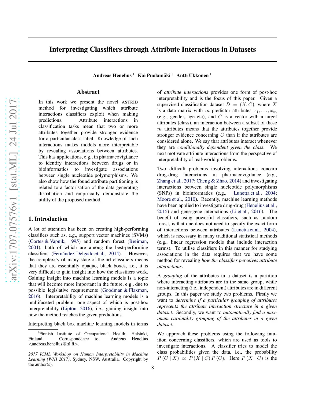 In this work we present the novel ASTRID method for investigating which attribute interactions classifiers exploit when making predictions. Attribute interactions in classification tasks mean that two or more attributes together provide stronger evidence for a particular class label. Knowledge of such interactions makes models more interpretable by revealing associations between attributes. This has applications, e.g., in pharmacovigilance to identify interactions between drugs or in bioinformatics to investigate associations between single nucleotide polymorphisms. We also show how the found attribute partitioning is related to a factorisation of the data generating distribution and empirically demonstrate the utility of the proposed method.