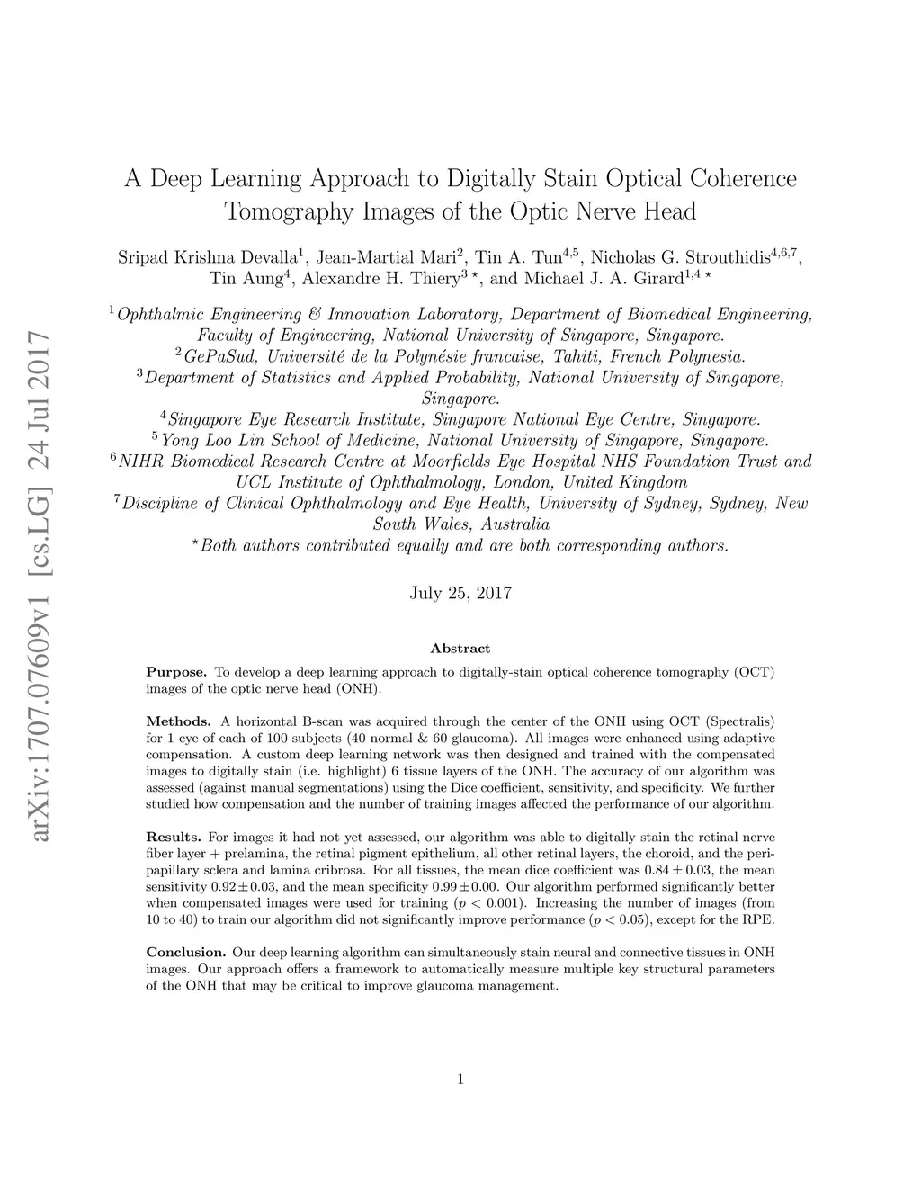 Purpose: To develop a deep learning approach to digitally-stain optical coherence tomography (OCT) images of the optic nerve head (ONH). Methods: A horizontal B-scan was acquired through the center of the ONH using OCT (Spectralis) for 1 eye of each of 100 subjects (40 normal & 60 glaucoma). All images were enhanced using adaptive compensation. A custom deep learning network was then designed and trained with the compensated images to digitally stain (i.e. highlight) 6 tissue layers of the ONH. The accuracy of our algorithm was assessed (against manual segmentations) using the Dice coefficient, sensitivity, and specificity. We further studied how compensation and the number of training images affected the performance of our algorithm. Results: For images it had not yet assessed, our algorithm was able to digitally stain the retinal nerve fiber layer + prelamina, the retinal pigment epithelium, all other retinal layers, the choroid, and the peripapillary sclera and lamina cribrosa. For all tissues, the mean dice coefficient was , the mean sensitivity , and the mean specificity . Our algorithm performed significantly better when compensated images were used for training. Increasing the number of images (from 10 to 40) to train our algorithm did not significantly improve performance, except for the RPE. Conclusion. Our deep learning algorithm can simultaneously stain neural and connective tissues in ONH images. Our approach offers a framework to automatically measure multiple key structural parameters of the ONH that may be critical to improve glaucoma management.