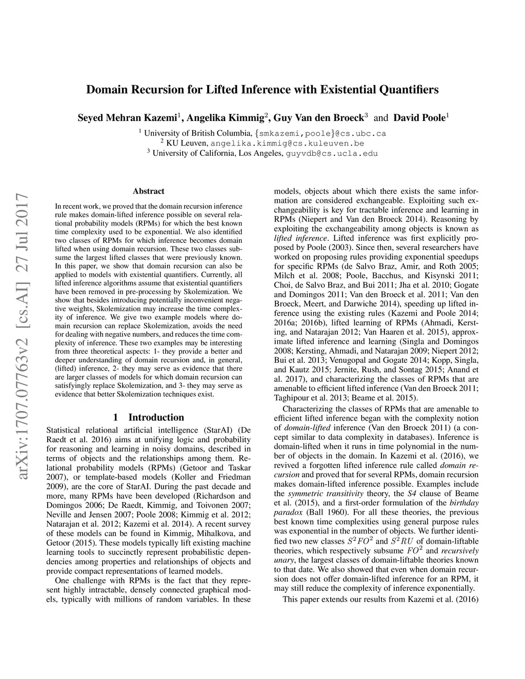 In recent work, we proved that the domain recursion inference rule makes domain-lifted inference possible on several relational probability models (RPMs) for which the best known time complexity used to be exponential. We also identified two classes of RPMs for which inference becomes domain lifted when using domain recursion. These two classes subsume the largest lifted classes that were previously known. In this paper, we show that domain recursion can also be applied to models with existential quantifiers. Currently, all lifted inference algorithms assume that existential quantifiers have been removed in pre-processing by Skolemization. We show that besides introducing potentially inconvenient negative weights, Skolemization may increase the time complexity of inference. We give two example models where domain recursion can replace Skolemization, avoids the need for dealing with negative numbers, and reduces the time complexity of inference. These two examples may be interesting from three theoretical aspects: 1- they provide a better and deeper understanding of domain recursion and, in general, (lifted) inference, 2- they may serve as evidence that there are larger classes of models for which domain recursion can satisfyingly replace Skolemization, and 3- they may serve as evidence that better Skolemization techniques exist.