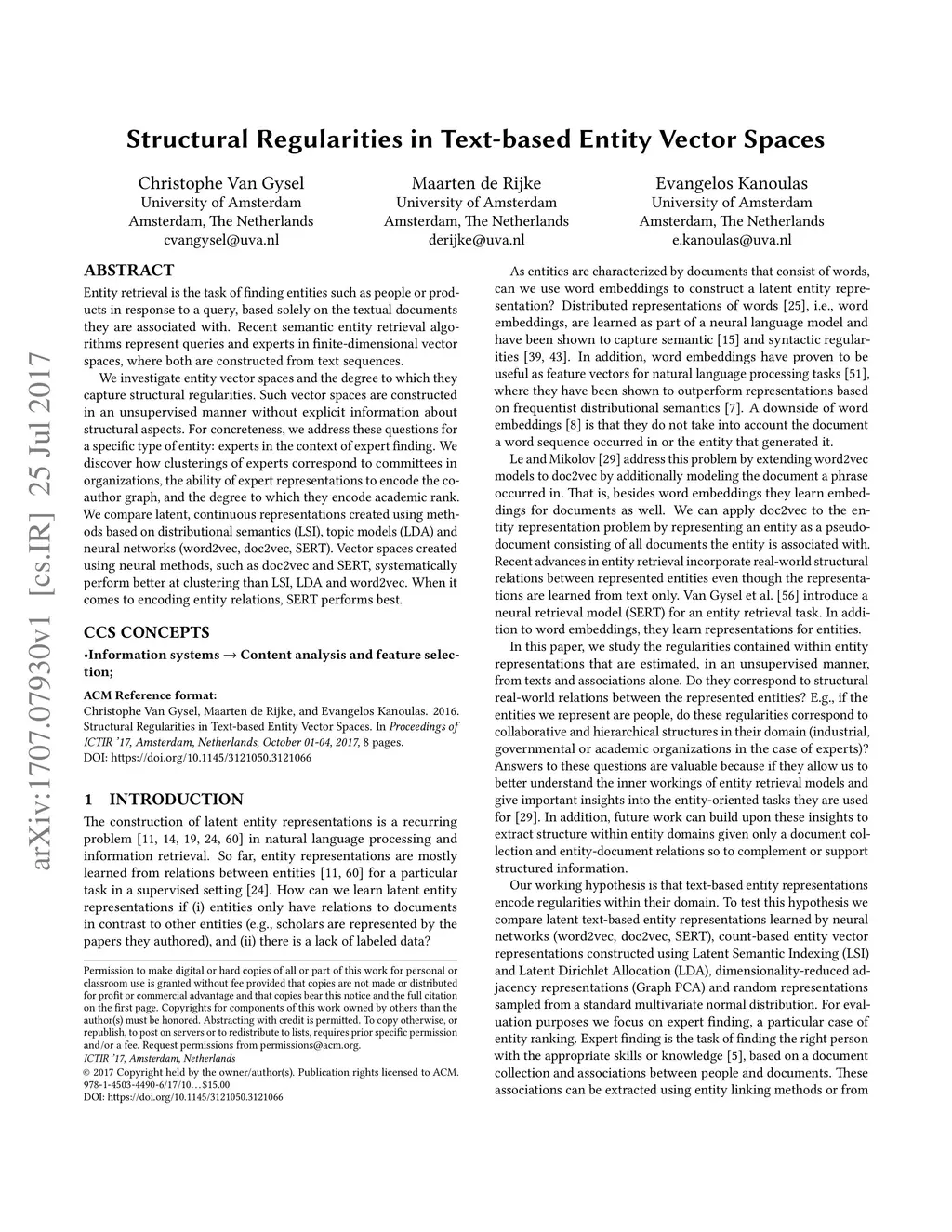 Entity retrieval is the task of finding entities such as people or products in response to a query, based solely on the textual documents they are associated with. Recent semantic entity retrieval algorithms represent queries and experts in finite-dimensional vector spaces, where both are constructed from text sequences. We investigate entity vector spaces and the degree to which they capture structural regularities. Such vector spaces are constructed in an unsupervised manner without explicit information about structural aspects. For concreteness, we address these questions for a specific type of entity: experts in the context of expert finding. We discover how clusterings of experts correspond to committees in organizations, the ability of expert representations to encode the co-author graph, and the degree to which they encode academic rank. We compare latent, continuous representations created using methods based on distributional semantics (LSI), topic models (LDA) and neural networks (word2vec, doc2vec, SERT). Vector spaces created using neural methods, such as doc2vec and SERT, systematically perform better at clustering than LSI, LDA and word2vec. When it comes to encoding entity relations, SERT performs best.
