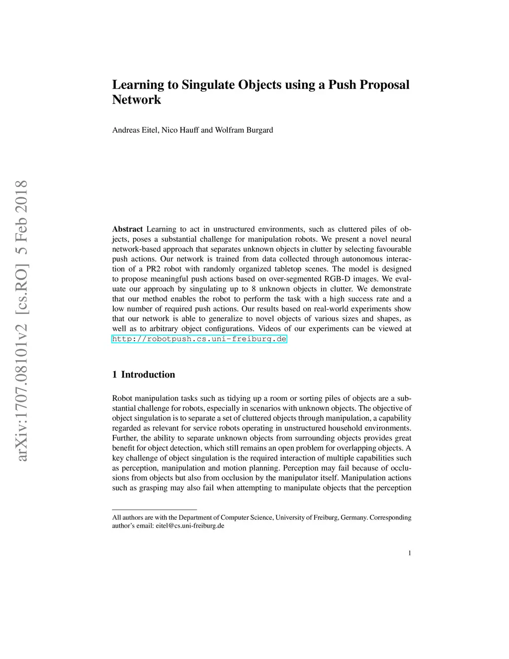 Learning to act in unstructured environments, such as cluttered piles of objects, poses a substantial challenge for manipulation robots. We present a novel neural network-based approach that separates unknown objects in clutter by selecting favourable push actions. Our network is trained from data collected through autonomous interaction of a PR2 robot with randomly organized tabletop scenes. The model is designed to propose meaningful push actions based on over-segmented RGB-D images. We evaluate our approach by singulating up to 8 unknown objects in clutter. We demonstrate that our method enables the robot to perform the task with a high success rate and a low number of required push actions. Our results based on real-world experiments show that our network is able to generalize to novel objects of various sizes and shapes, as well as to arbitrary object configurations. Videos of our experiments can be viewed at http://robotpush.cs.uni-freiburg.de