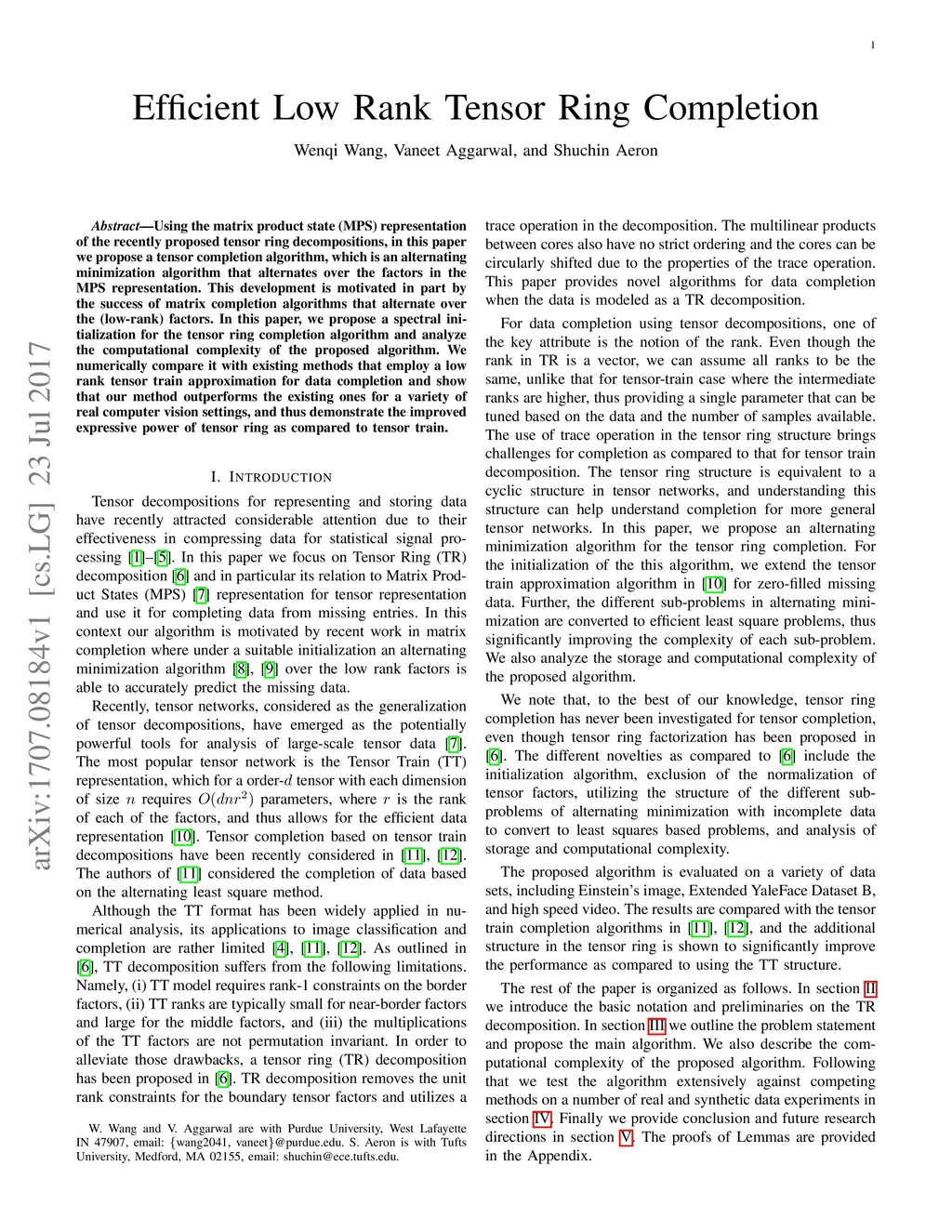 Using the matrix product state (MPS) representation of the recently proposed tensor ring decompositions, in this paper we propose a tensor completion algorithm, which is an alternating minimization algorithm that alternates over the factors in the MPS representation. This development is motivated in part by the success of matrix completion algorithms that alternate over the (low-rank) factors. In this paper, we propose a spectral initialization for the tensor ring completion algorithm and analyze the computational complexity of the proposed algorithm. We numerically compare it with existing methods that employ a low rank tensor train approximation for data completion and show that our method outperforms the existing ones for a variety of real computer vision settings, and thus demonstrate the improved expressive power of tensor ring as compared to tensor train.