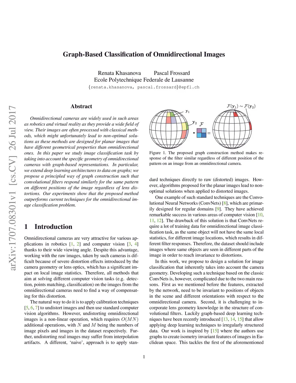 Omnidirectional cameras are widely used in such areas as robotics and virtual reality as they provide a wide field of view. Their images are often processed with classical methods, which might unfortunately lead to non-optimal solutions as these methods are designed for planar images that have different geometrical properties than omnidirectional ones. In this paper we study image classification task by taking into account the specific geometry of omnidirectional cameras with graph-based representations. In particular, we extend deep learning architectures to data on graphs; we propose a principled way of graph construction such that convolutional filters respond similarly for the same pattern on different positions of the image regardless of lens distortions. Our experiments show that the proposed method outperforms current techniques for the omnidirectional image classification problem.