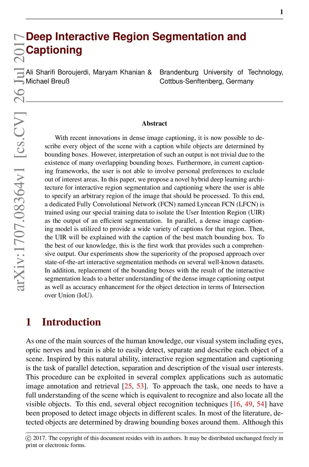 With recent innovations in dense image captioning, it is now possible to describe every object of the scene with a caption while objects are determined by bounding boxes. However, interpretation of such an output is not trivial due to the existence of many overlapping bounding boxes. Furthermore, in current captioning frameworks, the user is not able to involve personal preferences to exclude out of interest areas. In this paper, we propose a novel hybrid deep learning architecture for interactive region segmentation and captioning where the user is able to specify an arbitrary region of the image that should be processed. To this end, a dedicated Fully Convolutional Network (FCN) named Lyncean FCN (LFCN) is trained using our special training data to isolate the User Intention Region (UIR) as the output of an efficient segmentation. In parallel, a dense image captioning model is utilized to provide a wide variety of captions for that region. Then, the UIR will be explained with the caption of the best match bounding box. To the best of our knowledge, this is the first work that provides such a comprehensive output. Our experiments show the superiority of the proposed approach over state-of-the-art interactive segmentation methods on several well-known datasets. In addition, replacement of the bounding boxes with the result of the interactive segmentation leads to a better understanding of the dense image captioning output as well as accuracy enhancement for the object detection in terms of Intersection over Union (IoU).