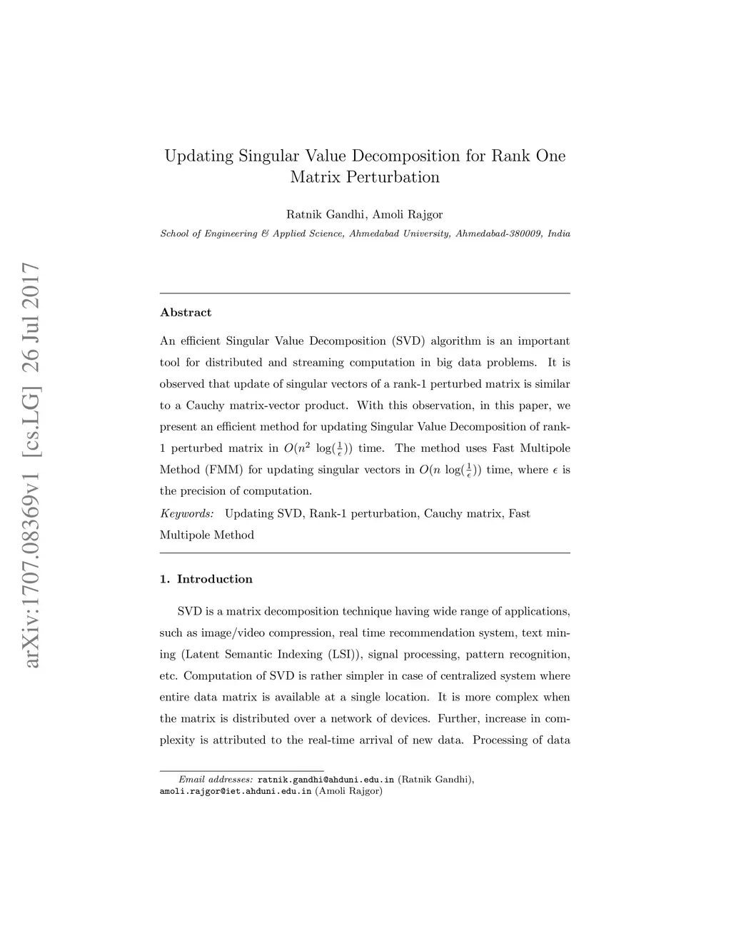 Updating Singular Value Decomposition for Rank One Matrix Perturbation