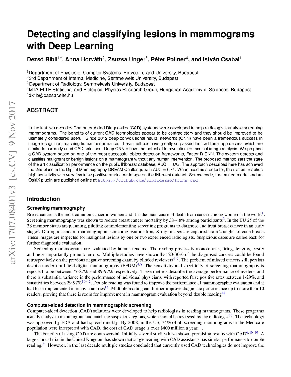 In the last two decades Computer Aided Diagnostics (CAD) systems were developed to help radiologists analyze screening mammograms. The benefits of current CAD technologies appear to be contradictory and they should be improved to be ultimately considered useful. Since 2012 deep convolutional neural networks (CNN) have been a tremendous success in image recognition, reaching human performance. These methods have greatly surpassed the traditional approaches, which are similar to currently used CAD solutions. Deep CNN-s have the potential to revolutionize medical image analysis. We propose a CAD system based on one of the most successful object detection frameworks, Faster R-CNN. The system detects and classifies malignant or benign lesions on a mammogram without any human intervention. The proposed method sets the state of the art classification performance on the public INbreast database, AUC = 0.95 . The approach described here has achieved the 2nd place in the Digital Mammography DREAM Challenge with AUC = 0.85 . When used as a detector, the system reaches high sensitivity with very few false positive marks per image on the INbreast dataset. Source code, the trained model and an OsiriX plugin are availaible online at https://github.com/riblidezso/frcnn_cad .