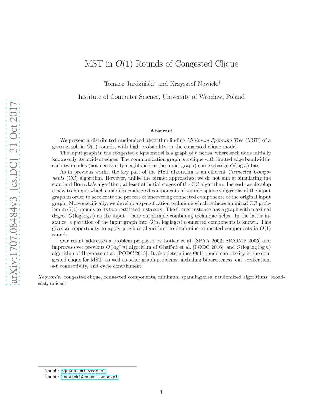 We present a distributed randomized algorithm finding Minimum Spanning Tree (MST) of a given graph in O(1) rounds, with high probability, in the Congested Clique model. The input graph in the Congested Clique model is a graph of n nodes, where each node initially knows only its incident edges. The communication graph is a clique with limited edge bandwidth: each two nodes (not necessarily neighbours in the input graph) can exchange bits. As in previous works, the key part of the MST algorithm is an efficient Connected Components (CC) algorithm. However, unlike the former approaches, we do not aim at simulating the standard Boruvka algorithm, at least at initial stages of the CC algorithm. Instead, we develop a new technique which combines connected components of sample sparse subgraphs of the input graph in order to accelerate the process of uncovering connected components of the original input graph. More specifically, we develop a sparsification technique which reduces an initial CC problem in rounds to its two restricted instances. The former instance has a graph with maximal degree as the input -- here our sample-combining technique helps. In the latter instance, a partition of the input graph into connected components is known. This gives an opportunity to apply previous algorithms to determine connected components in rounds. Our result addresses the problem from and the algorithm of Lotker et al. [SPAA 2003; SICOMP 2005], improves over previous algorithm of Ghaffari et al. [PODC 2016] and algorithm of Hegeman et al. [PODC 2015] . It also determines round complexity in the congested clique for MST, as well as other graph problems, including bipartiteness, cut verification, s-t connectivity and cycle containment.