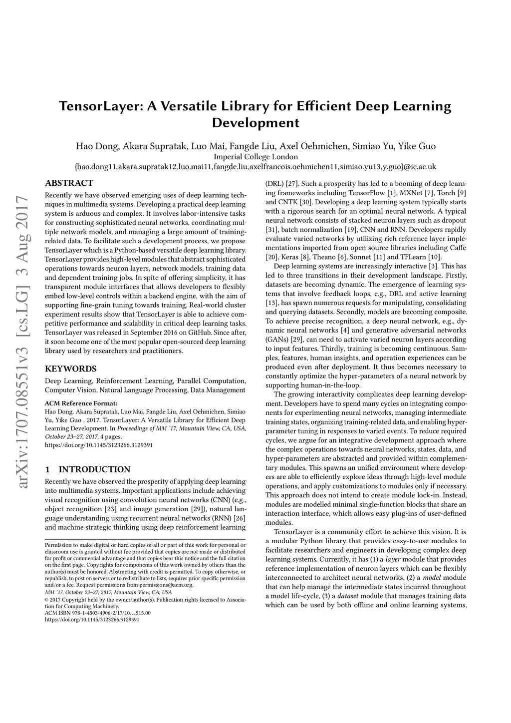 Deep learning has enabled major advances in the fields of computer vision, natural language processing, and multimedia among many others. Developing a deep learning system is arduous and complex, as it involves constructing neural network architectures, managing training/trained models, tuning optimization process, preprocessing and organizing data, etc. TensorLayer is a versatile Python library that aims at helping researchers and engineers efficiently develop deep learning systems. It offers rich abstractions for neural networks, model and data management, and parallel workflow mechanism. While boosting efficiency, TensorLayer maintains both performance and scalability. TensorLayer was released in September 2016 on GitHub, and has helped people from academia and industry develop real-world applications of deep learning.