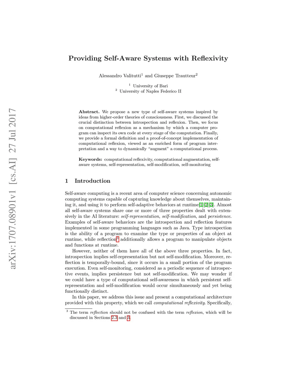 We propose a new type of self-aware systems inspired by ideas from higher-order theories of consciousness. First, we discussed the crucial distinction between introspection and reflexion. Then, we focus on computational reflexion as a mechanism by which a computer program can inspect its own code at every stage of the computation. Finally, we provide a formal definition and a proof-of-concept implementation of computational reflexion, viewed as an enriched form of program interpretation and a way to dynamically "augment" a computational process.