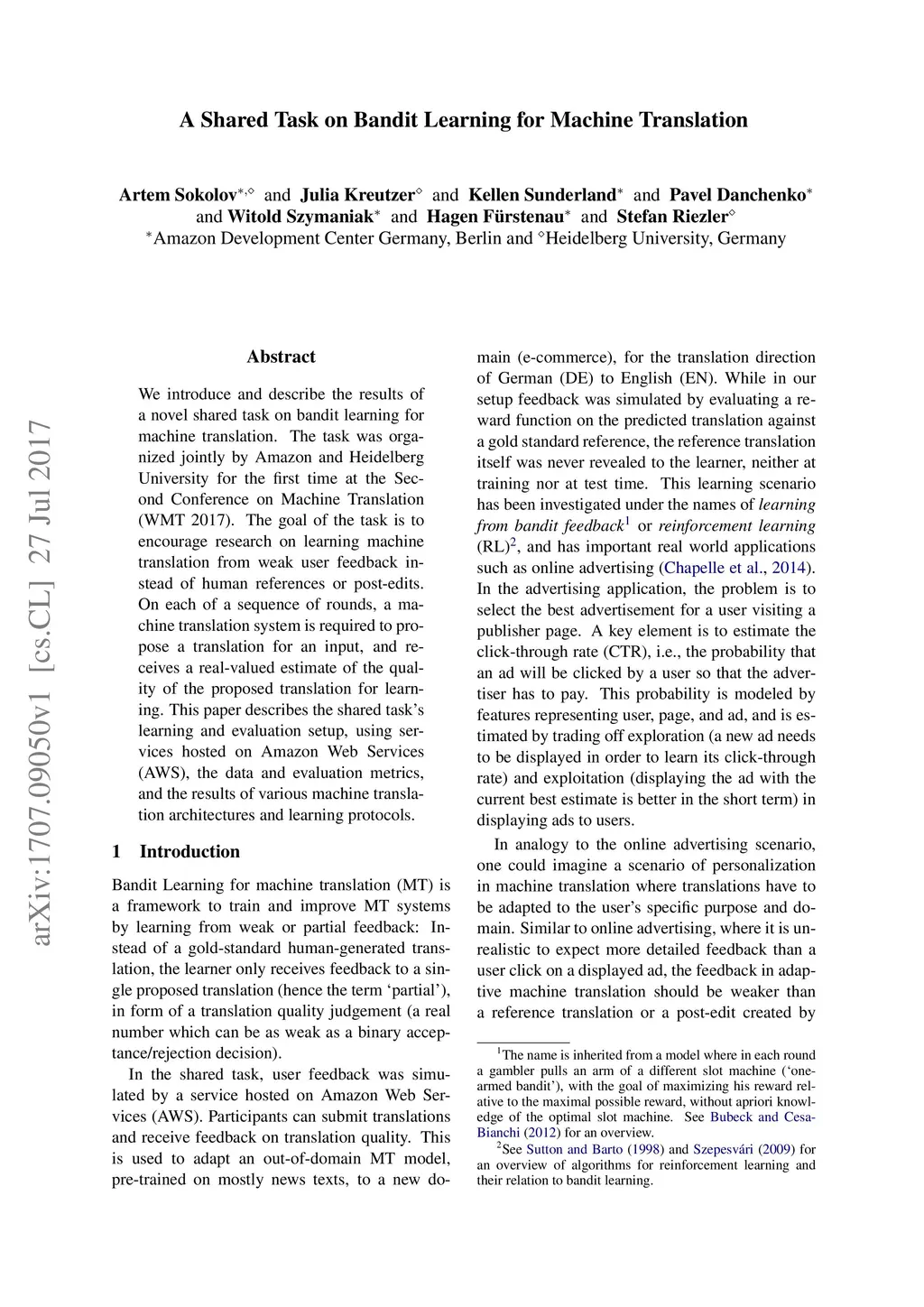 We introduce and describe the results of a novel shared task on bandit learning for machine translation. The task was organized jointly by Amazon and Heidelberg University for the first time at the Second Conference on Machine Translation (WMT 2017). The goal of the task is to encourage research on learning machine translation from weak user feedback instead of human references or post-edits. On each of a sequence of rounds, a machine translation system is required to propose a translation for an input, and receives a real-valued estimate of the quality of the proposed translation for learning. This paper describes the shared task's learning and evaluation setup, using services hosted on Amazon Web Services (AWS), the data and evaluation metrics, and the results of various machine translation architectures and learning protocols.