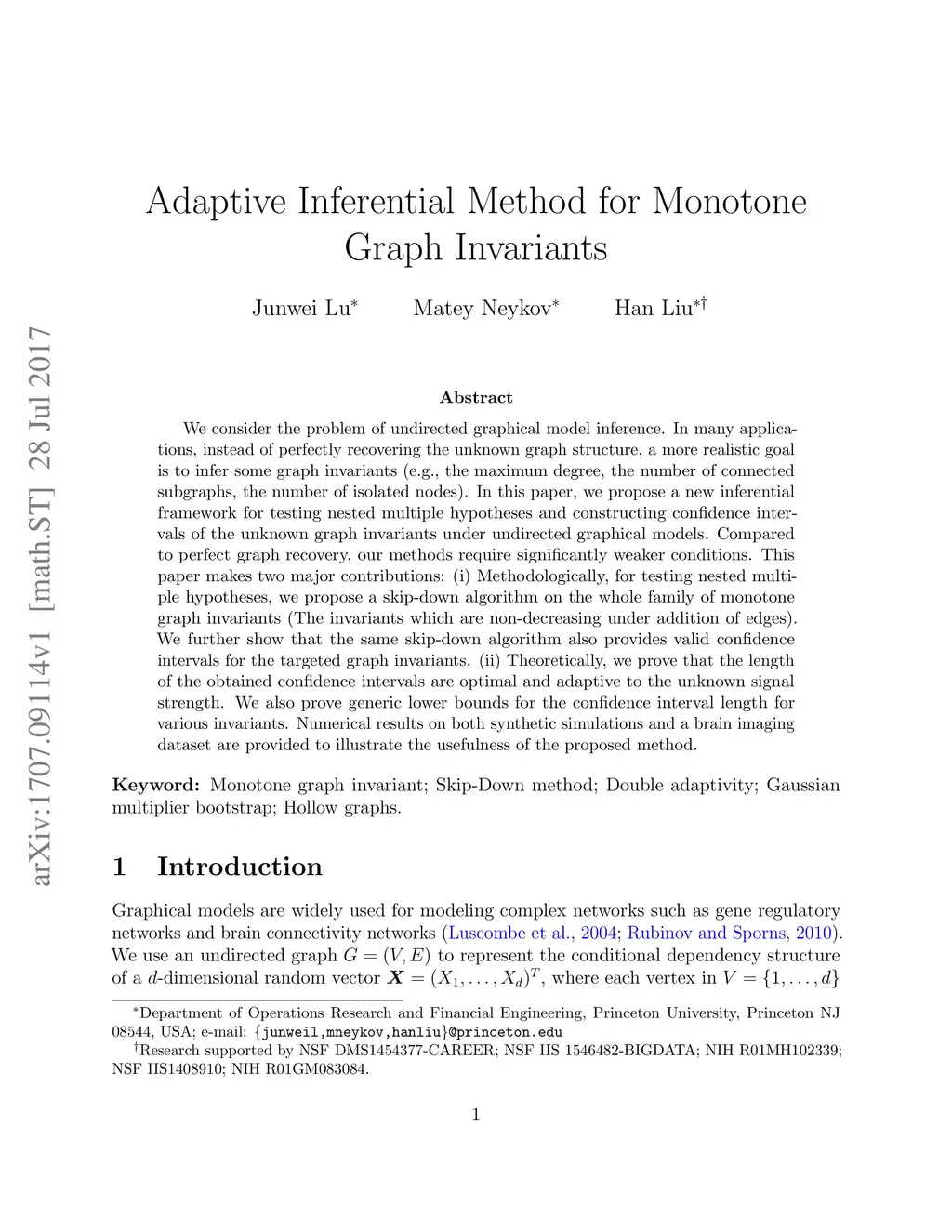 We consider the problem of undirected graphical model inference. In many applications, instead of perfectly recovering the unknown graph structure, a more realistic goal is to infer some graph invariants (e.g., the maximum degree, the number of connected subgraphs, the number of isolated nodes). In this paper, we propose a new inferential framework for testing nested multiple hypotheses and constructing confidence intervals of the unknown graph invariants under undirected graphical models. Compared to perfect graph recovery, our methods require significantly weaker conditions. This paper makes two major contributions: (i) Methodologically, for testing nested multiple hypotheses, we propose a skip-down algorithm on the whole family of monotone graph invariants (The invariants which are non-decreasing under addition of edges). We further show that the same skip-down algorithm also provides valid confidence intervals for the targeted graph invariants. (ii) Theoretically, we prove that the length of the obtained confidence intervals are optimal and adaptive to the unknown signal strength. We also prove generic lower bounds for the confidence interval length for various invariants. Numerical results on both synthetic simulations and a brain imaging dataset are provided to illustrate the usefulness of the proposed method.