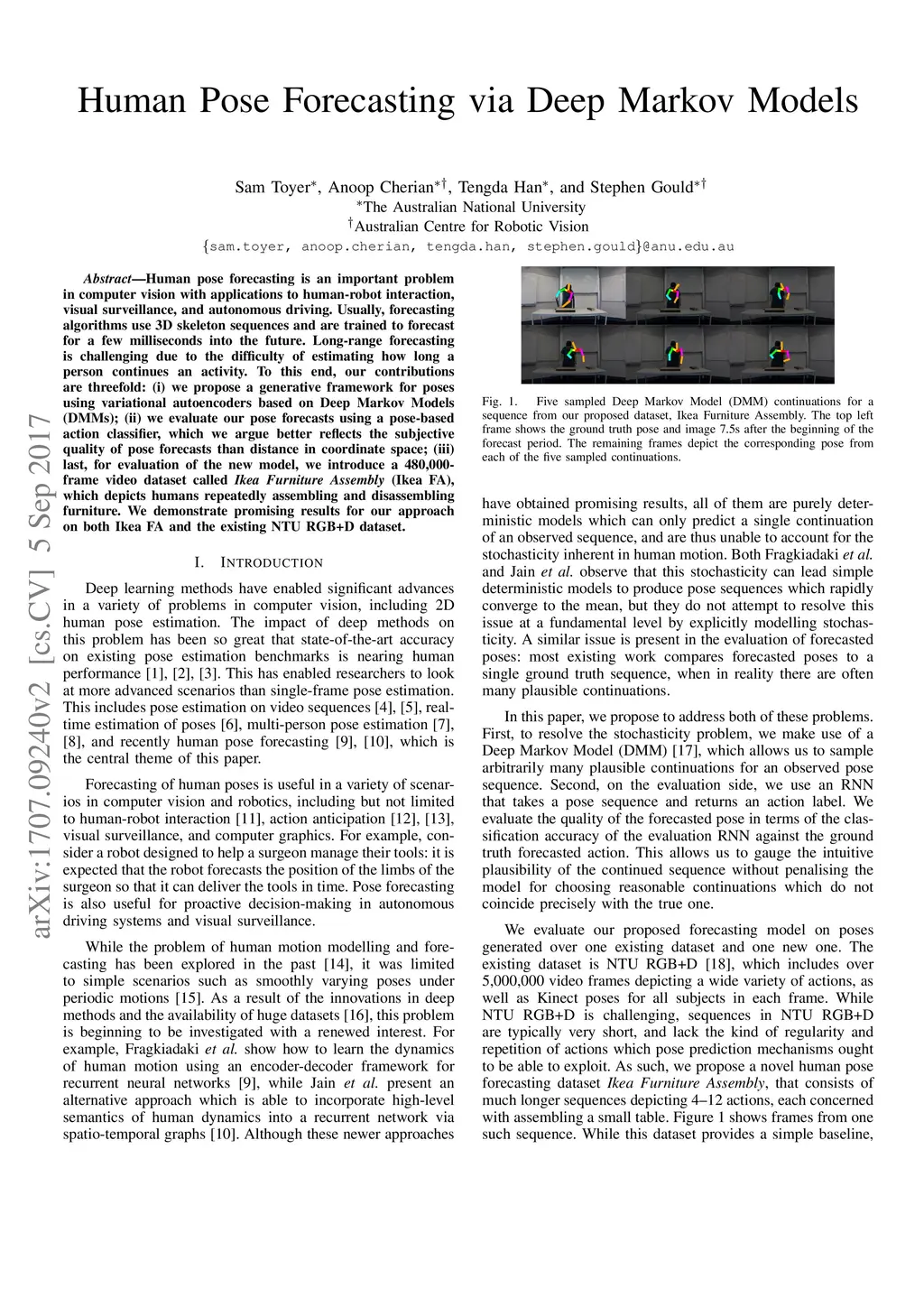 Human pose forecasting is an important problem in computer vision with applications to human-robot interaction, visual surveillance, and autonomous driving. Usually, forecasting algorithms use 3D skeleton sequences and are trained to forecast for a few milliseconds into the future. Long-range forecasting is challenging due to the difficulty of estimating how long a person continues an activity. To this end, our contributions are threefold: (i) we propose a generative framework for poses using variational autoencoders based on Deep Markov Models (DMMs); (ii) we evaluate our pose forecasts using a pose-based action classifier, which we argue better reflects the subjective quality of pose forecasts than distance in coordinate space; (iii) last, for evaluation of the new model, we introduce a 480,000-frame video dataset called Ikea Furniture Assembly (Ikea FA), which depicts humans repeatedly assembling and disassembling furniture. We demonstrate promising results for our approach on both Ikea FA and the existing NTU RGB+D dataset.
