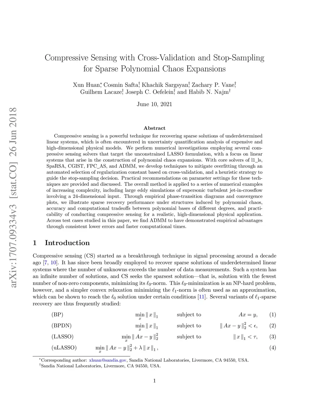Compressive sensing is a powerful technique for recovering sparse solutions of underdetermined linear systems, which is often encountered in uncertainty quantification analysis of expensive and high-dimensional physical models. We perform numerical investigations employing several compressive sensing solvers that target the unconstrained LASSO formulation, with a focus on linear systems that arise in the construction of polynomial chaos expansions. With core solvers of l1_ls, SpaRSA, CGIST, FPC_AS, and ADMM, we develop techniques to mitigate overfitting through an automated selection of regularization constant based on cross-validation, and a heuristic strategy to guide the stop-sampling decision. Practical recommendations on parameter settings for these techniques are provided and discussed. The overall method is applied to a series of numerical examples of increasing complexity, including large eddy simulations of supersonic turbulent jet-in-crossflow involving a 24-dimensional input. Through empirical phase-transition diagrams and convergence plots, we illustrate sparse recovery performance under structures induced by polynomial chaos, accuracy and computational tradeoffs between polynomial bases of different degrees, and practicability of conducting compressive sensing for a realistic, high-dimensional physical application. Across test cases studied in this paper, we find ADMM to have demonstrated empirical advantages through consistent lower errors and faster computational times.