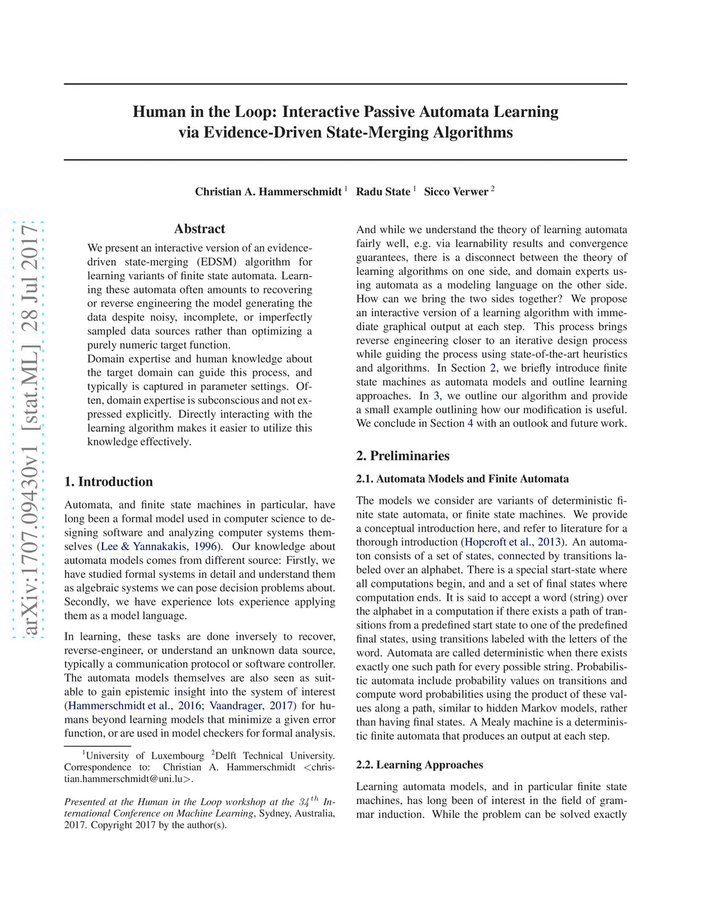 We present an interactive version of an evidence-driven state-merging (EDSM) algorithm for learning variants of finite state automata. Learning these automata often amounts to recovering or reverse engineering the model generating the data despite noisy, incomplete, or imperfectly sampled data sources rather than optimizing a purely numeric target function. Domain expertise and human knowledge about the target domain can guide this process, and typically is captured in parameter settings. Often, domain expertise is subconscious and not expressed explicitly. Directly interacting with the learning algorithm makes it easier to utilize this knowledge effectively.