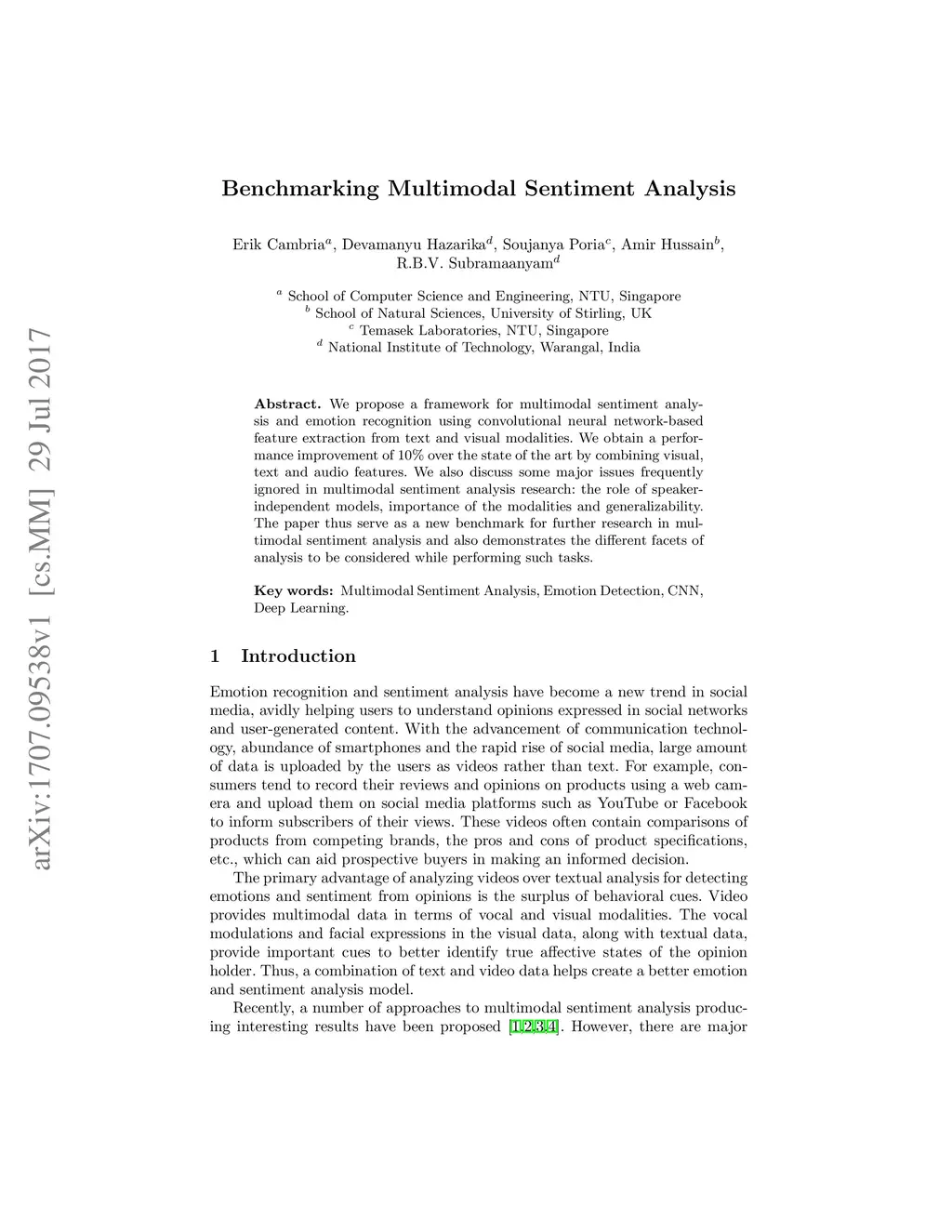We propose a framework for multimodal sentiment analysis and emotion recognition using convolutional neural network-based feature extraction from text and visual modalities. We obtain a performance improvement of 10% over the state of the art by combining visual, text and audio features. We also discuss some major issues frequently ignored in multimodal sentiment analysis research: the role of speaker-independent models, importance of the modalities and generalizability. The paper thus serve as a new benchmark for further research in multimodal sentiment analysis and also demonstrates the different facets of analysis to be considered while performing such tasks.
