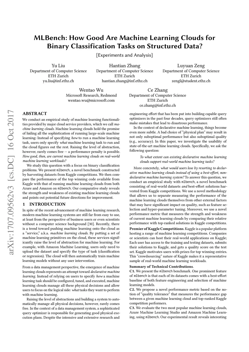 MLBench: How Good Are Machine Learning Clouds for Binary Classification